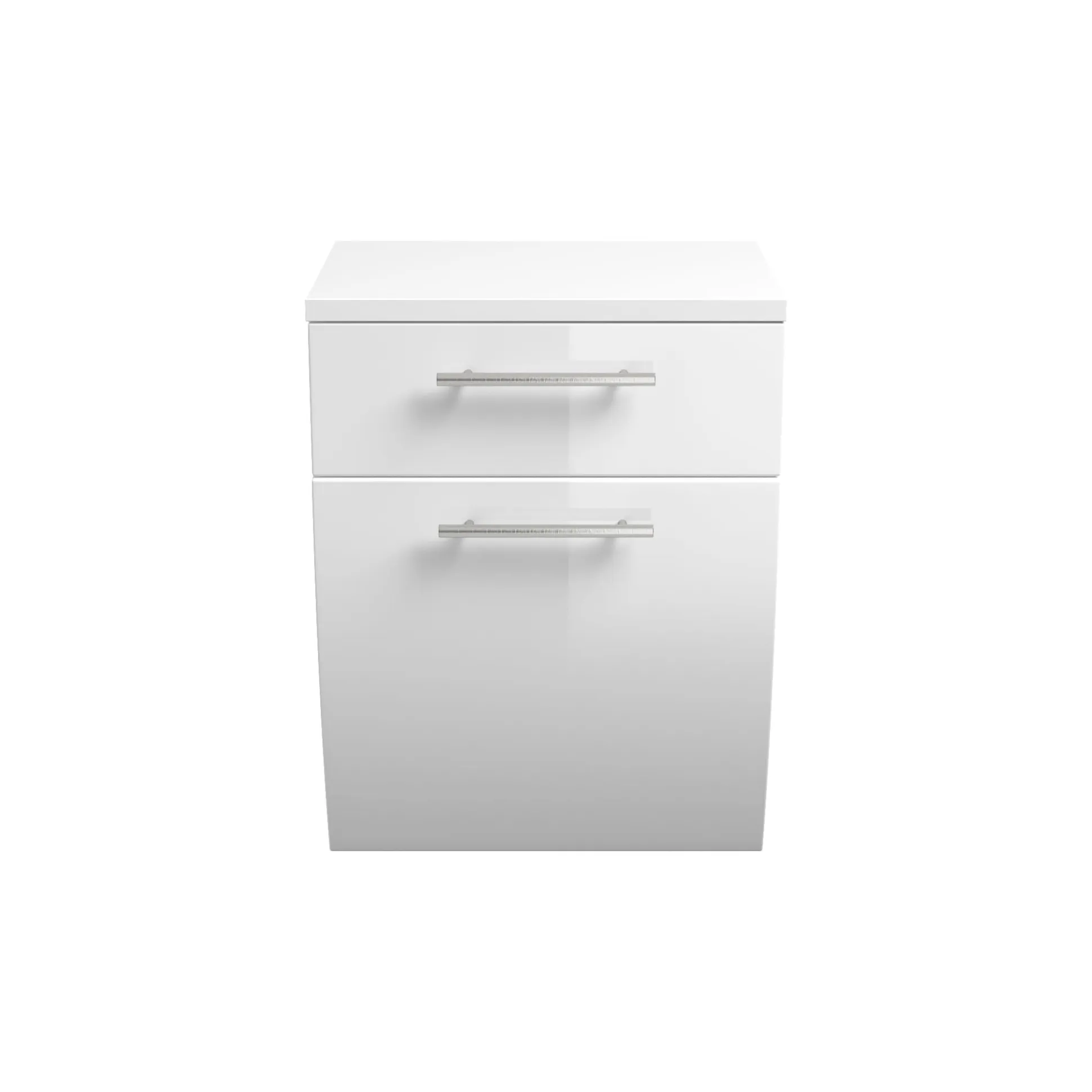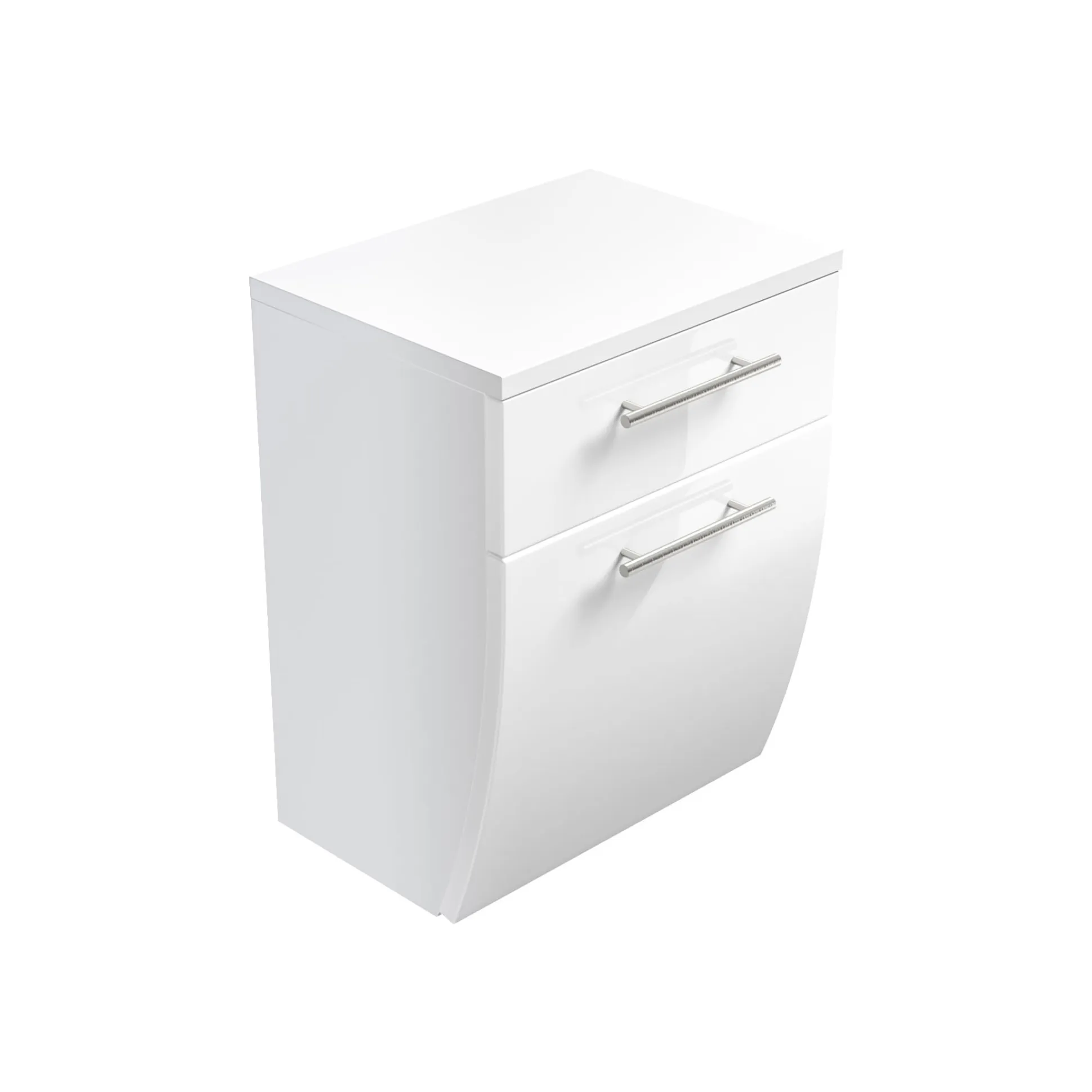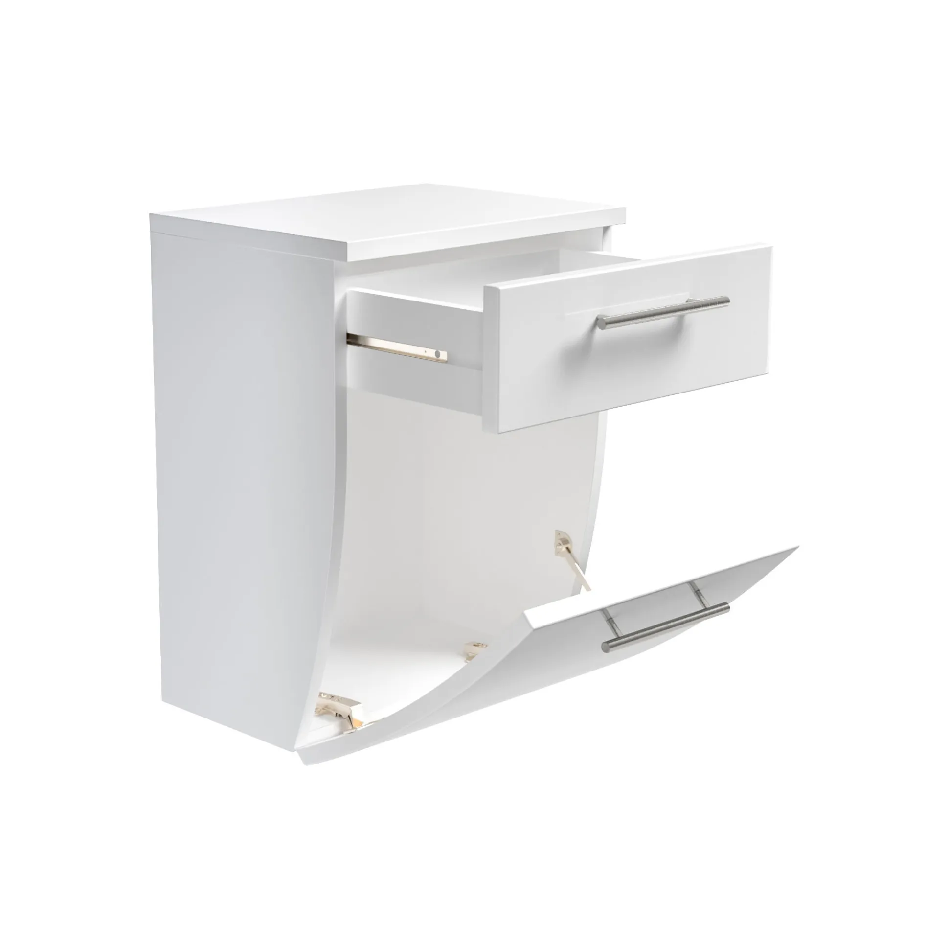 Deze klassieke badkamer kast biedt voldoende opbergruimte voor al je badkamerbenodigdheden. In de lade kun je gemakkelijk je dagelijks spullen kwijt, achter de gebogen klep de schone handdoeken. De hoogglans fronten in combinatie met de metalen handgrepen maken deze kast af. Door zijn melamine afwerking is deze kast gemakkelijk schoon te houden en langer beschermd tegen stof, vuil en krassen. Richt je badkamer in één keer helemaal in met de bijpassende meubelen uit deze serie!