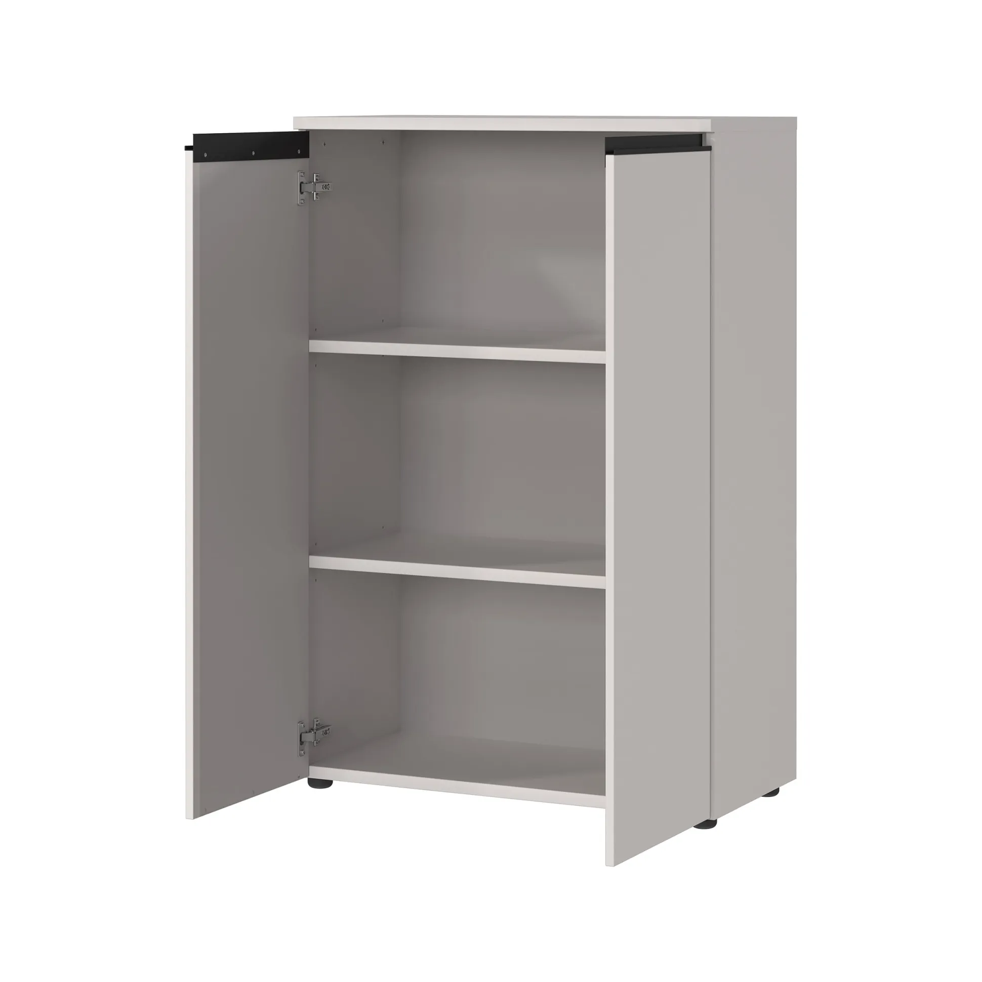 De lage kantoorkast Chicago Kasjmier combineert functionaliteit met een modern design. Achter de twee deuren bevinden zich twee verstelbare legborden die elk tot 10 kg kunnen dragen. Het bovenblad is belastbaar tot 10 kg, terwijl het onderste legbord een maximale belasting van 30 kg heeft. De kast is voorzien van een krasbestendige afwerking en geïntegreerde soft-close deuren.