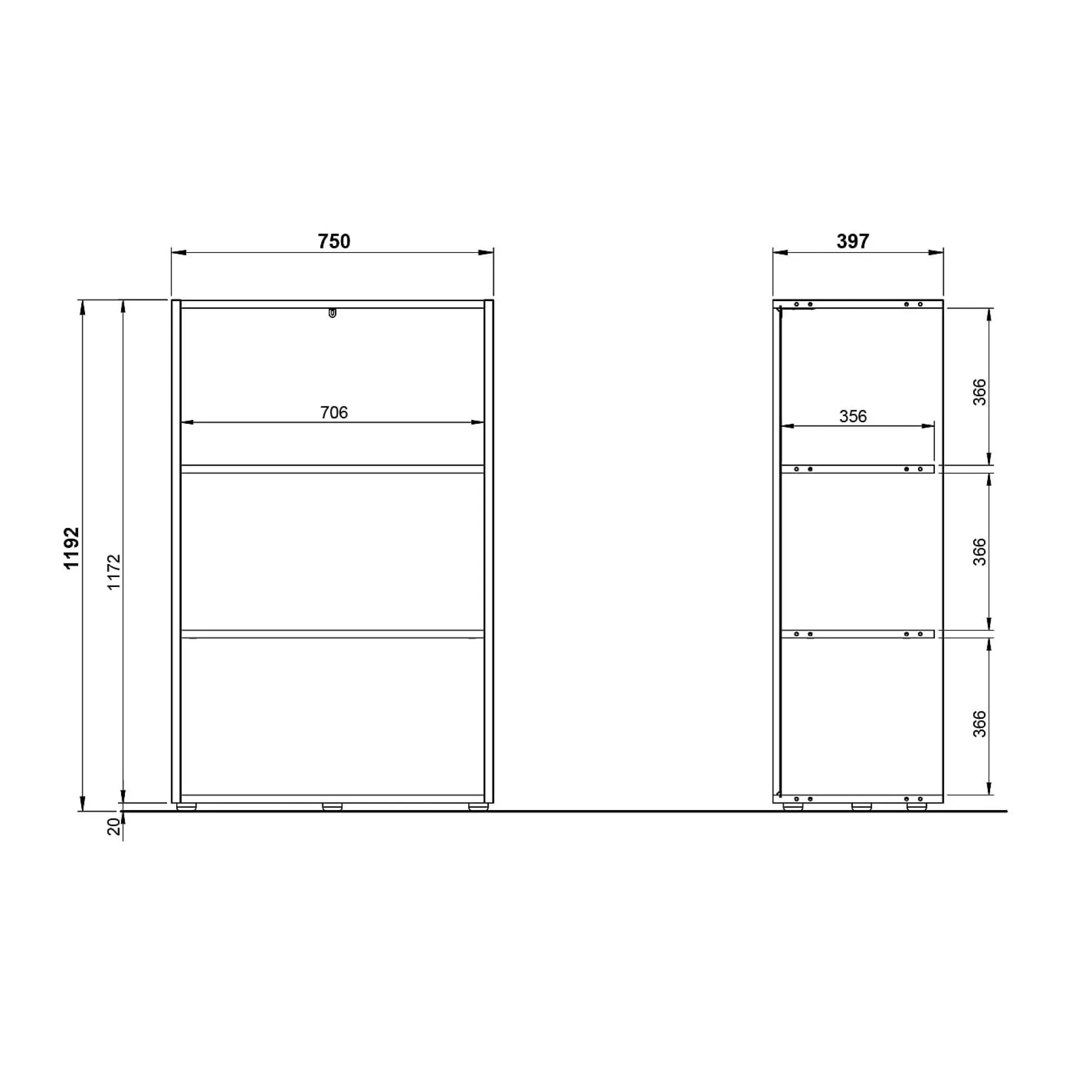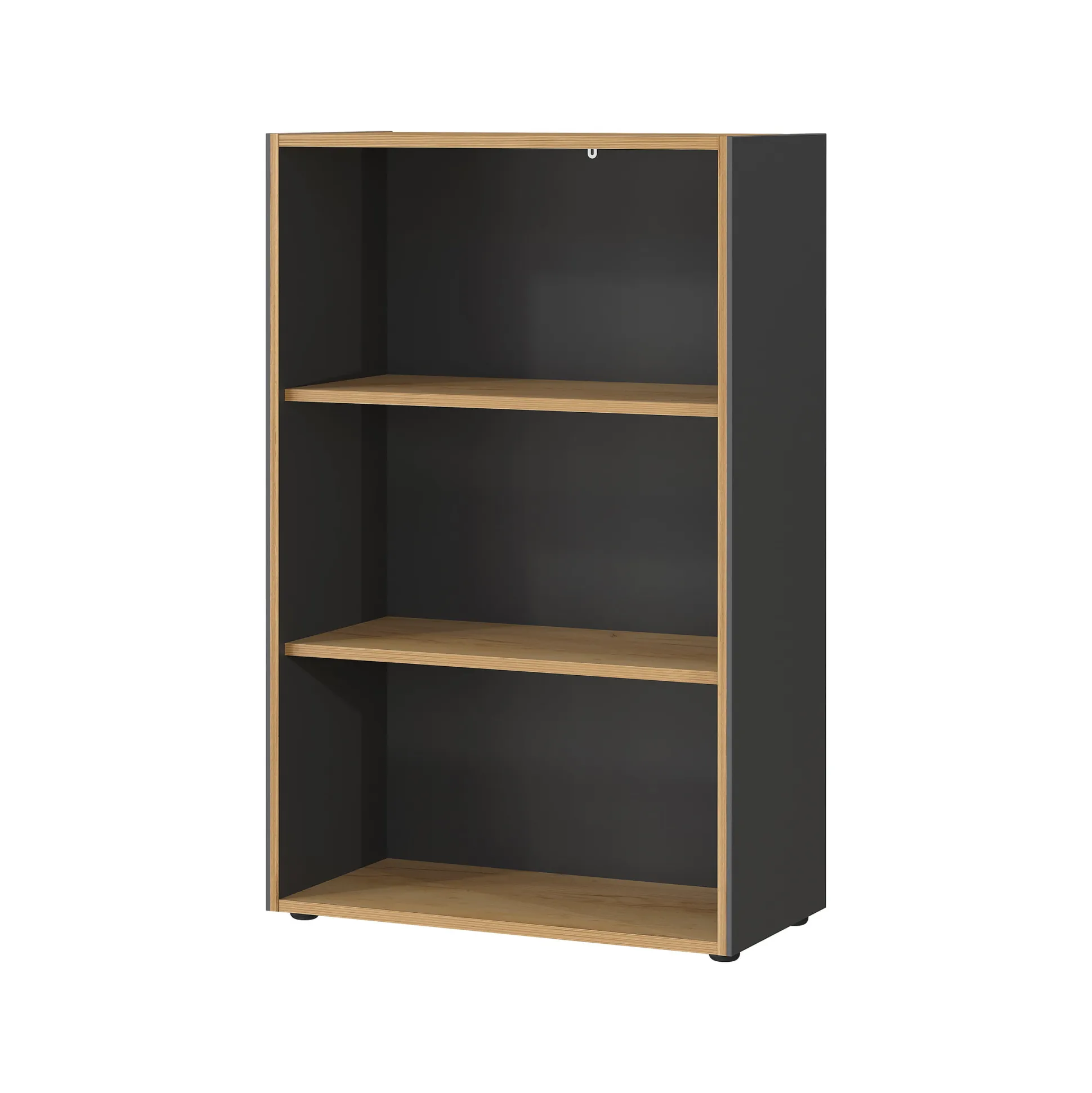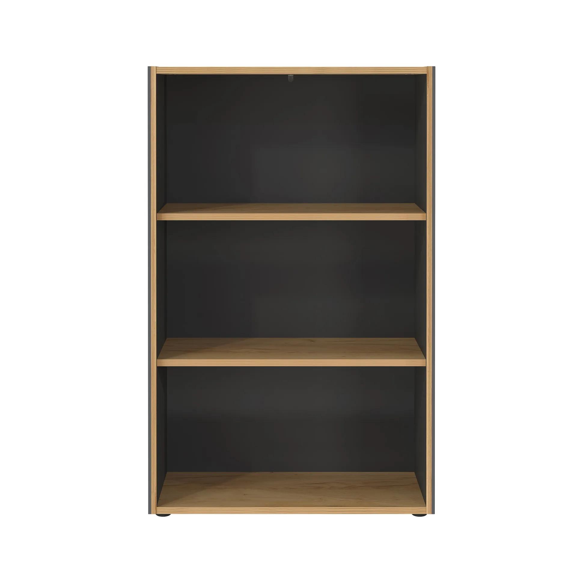 Ontdek de Lage Open Kantoorkast Pytheas Grafiet Eiken, een praktische opbergoplossing met twee vaste planken (elk belastbaar tot 22 kg).