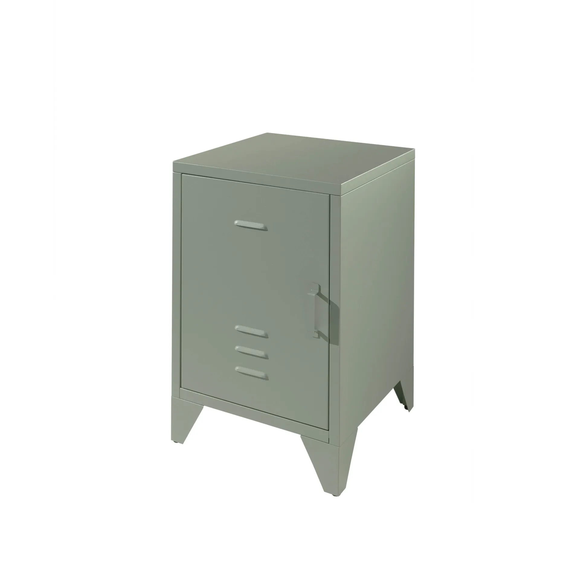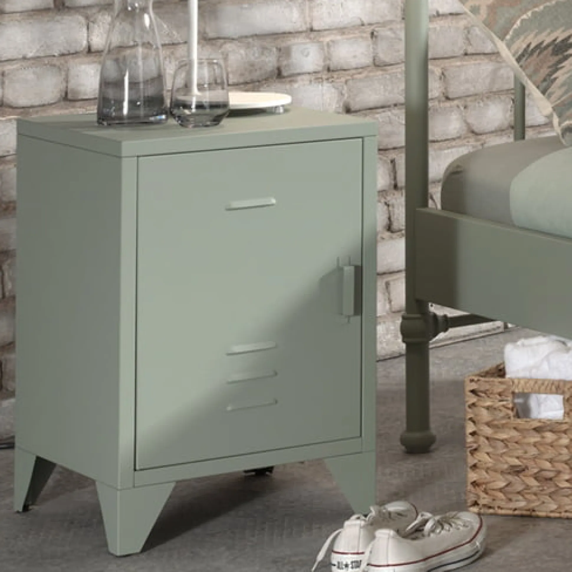 Dit metalen industriële nachtkastje is afgewerkt met een mat groene poederlak. Achter het deurtje bevindt zich 1 legplank om al je spullen in kwijt te kunnen. Verkrijgbaar in verschillende kleuren en goed te combineren met de rest van deze serie.