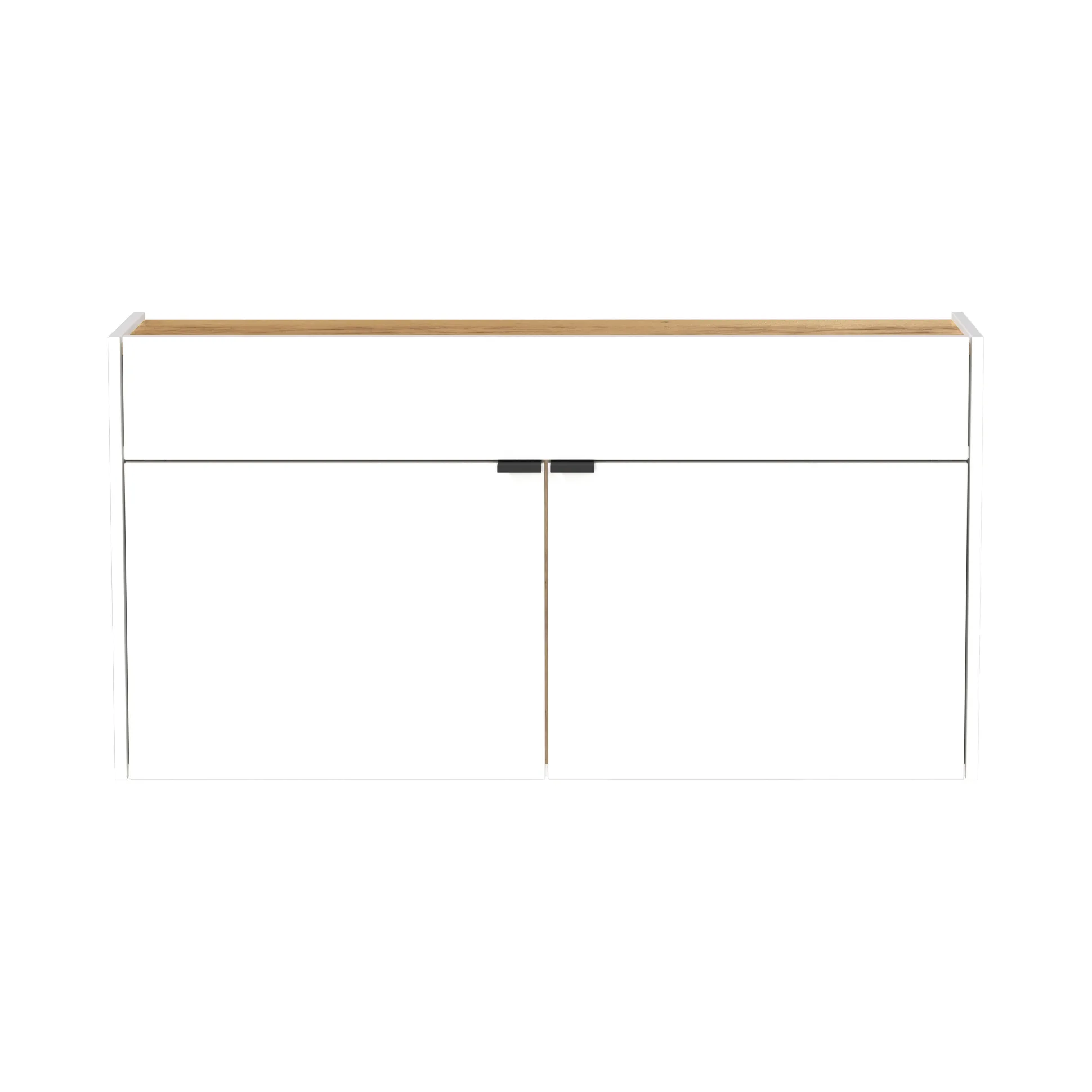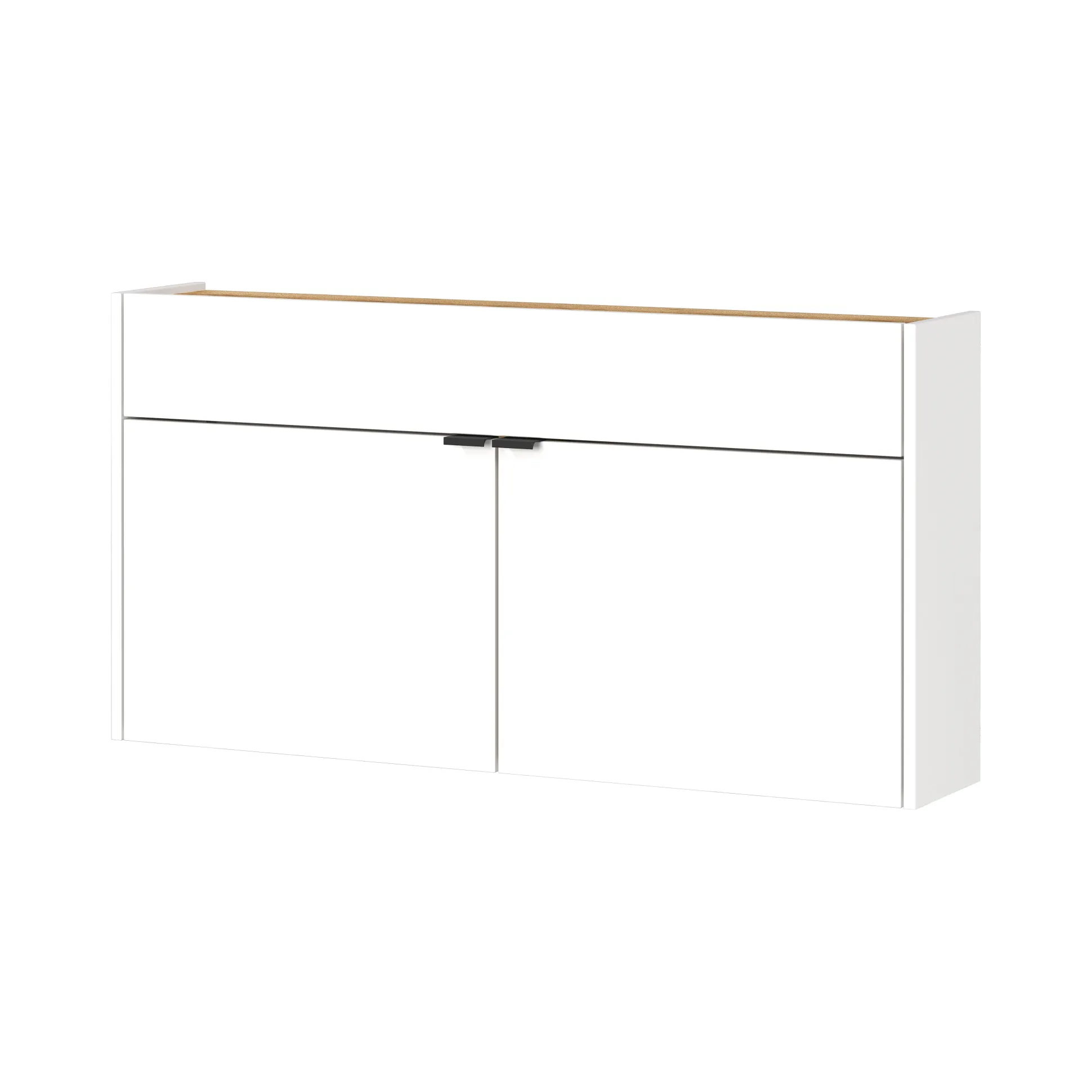 Deze multifunctionele kast heeft één verdeelde lade (belastbaar aan elke zijde tot 3 kg) en twee deuren, met achter de deuren een middelste plank en in totaal 4 verstelbare planken (elk belastbaar tot 5 kg). De bovenste plank kan tot 7 kg dragen en de onderste plank tot 10 kg. De bovenste plank en de legplanken zijn uitgevoerd in eikenkleur, terwijl de rest van de kast in wit is uitgevoerd. De kast heeft 2 handgrepen aan de voorkant gemaakt van zwart gepoedercoat metaal. Er is ruimte voor maximaal 12 paar schoenen. De kast is voorzien van een melamineharscoating, ABS-randen en deuren met demping. Deze schoenenkast heeft een geringe diepte (slechts 22 cm) en kan hangend worden gemonteerd. Het meubelstuk wordt duurzaam verpakt en is vervaardigd in Duitsland.