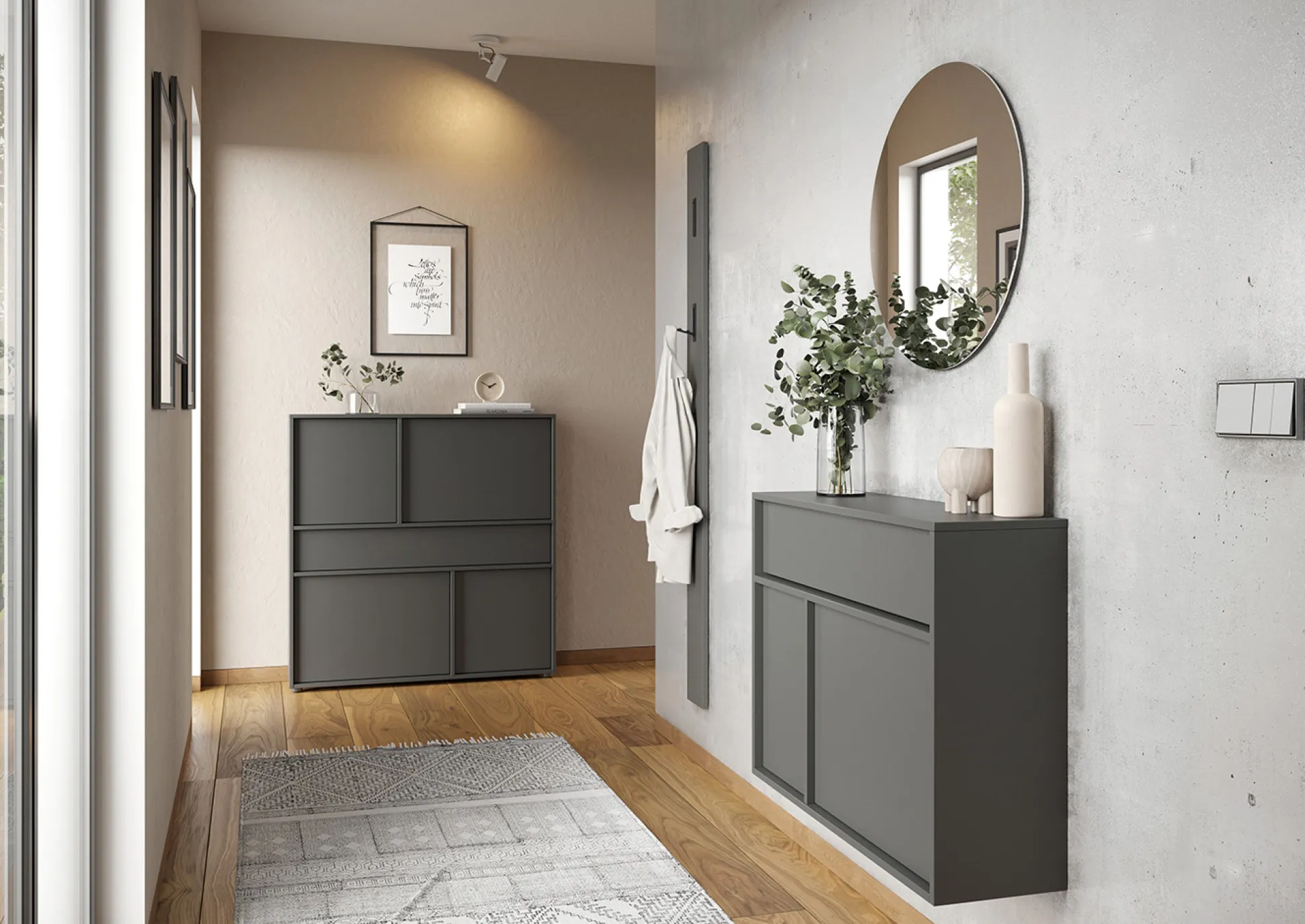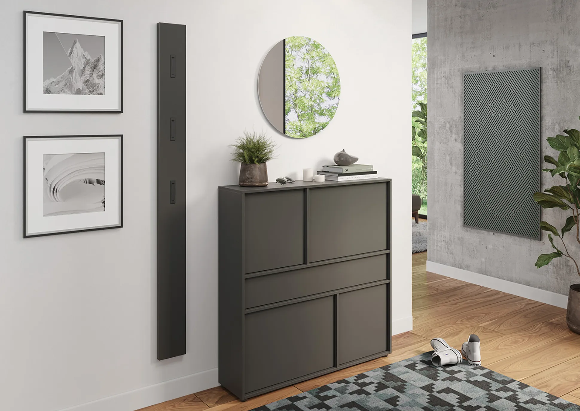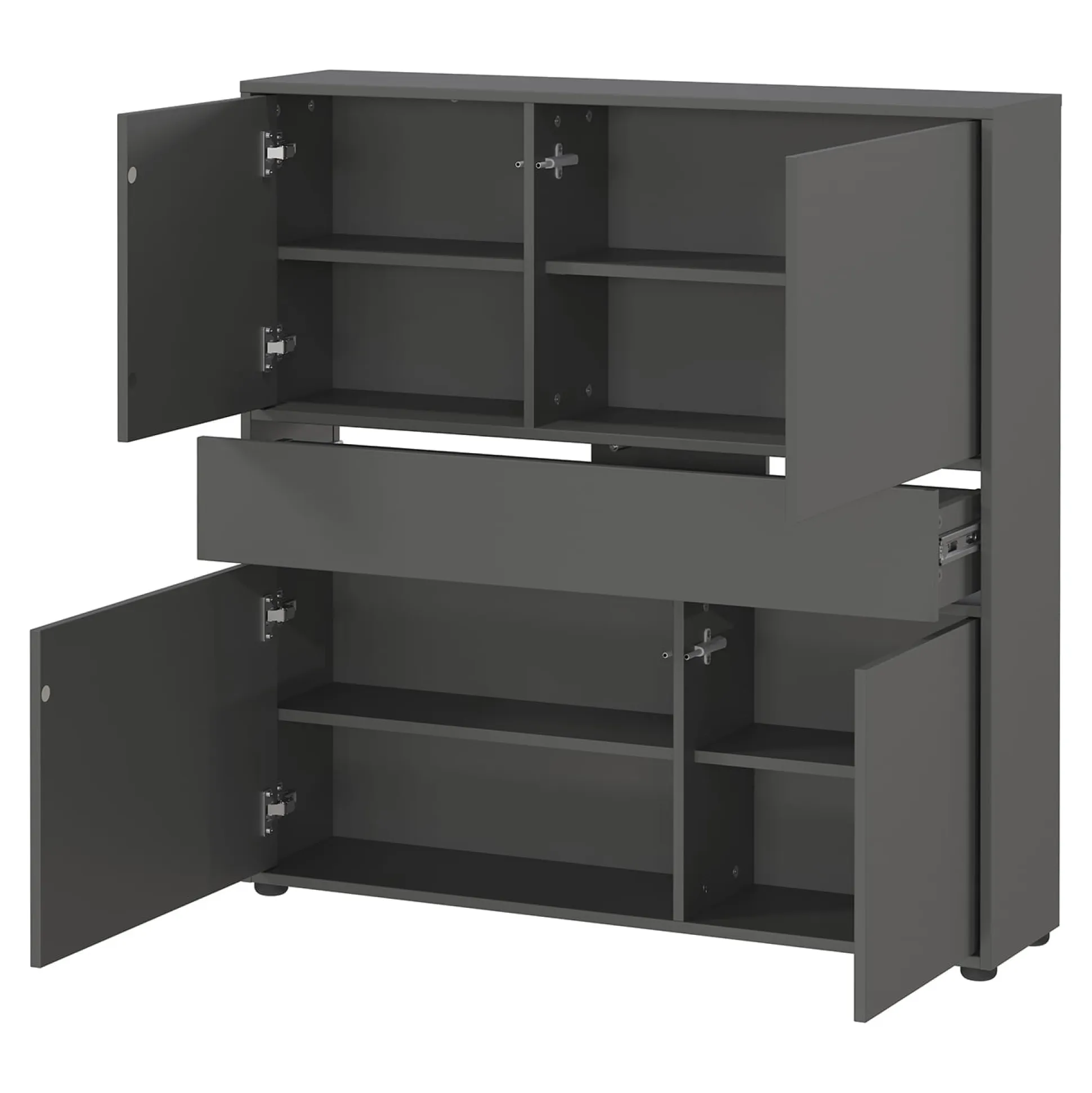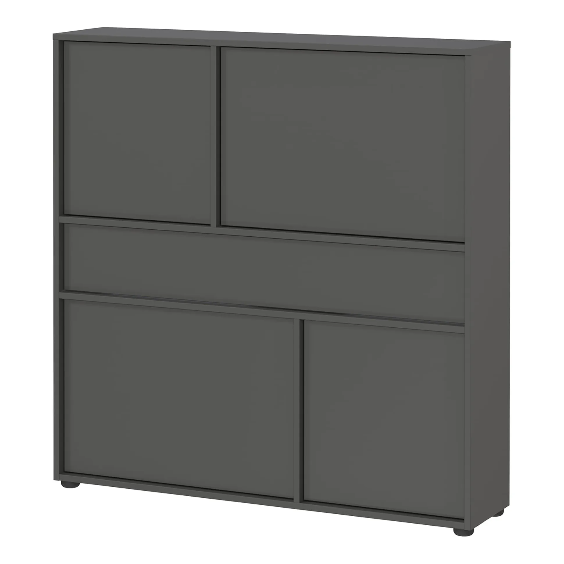 De opbergkast Mathieu 105 cm is een multifunctioneel meubel dat zowel stijl als functionaliteit biedt. De kast heeft één lade met een draagvermogen tot 10 kg en twee deuren met daarachter 4 planken, elk belastbaar tot 10 kg. De grafietkleurige afwerking geeft de kast een moderne look, terwijl de krasbestendige melamineharscoating de kast perfect maakt voor dagelijks gebruik. Dankzij de ondiepe diepte is deze kast ideaal voor smalle gangen.