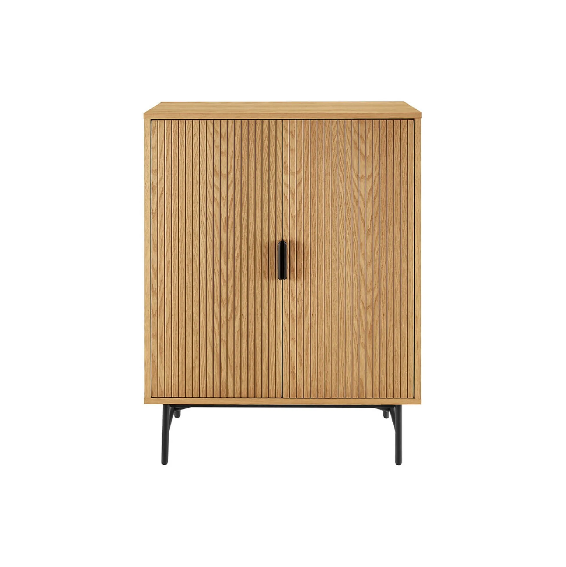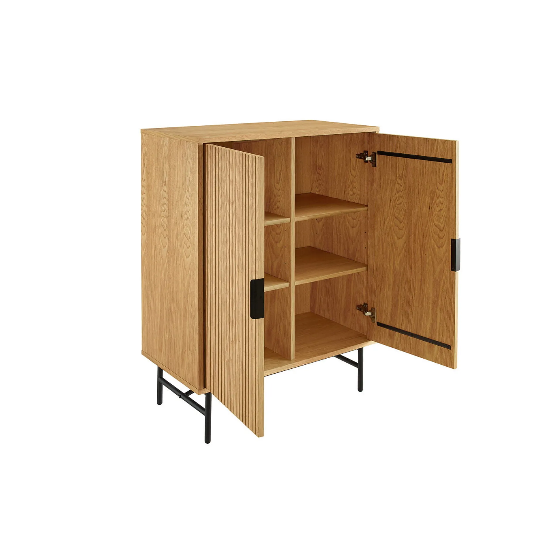 De deuren van deze degelijke opbergkast zijn voorzien van soft-close waardoor deze geruisloos sluiten. Achter elke deur bevinden zich 2 verstelbare legplanken. Dit meubel is vervaardigd uit een combinatie van gefineerd eiken MDF en melamine. Het zwarte gepoedercoate metalen frame maakt dat dit meubel stevig staat. Gemakkelijk te monteren door middel van bijgeleverde montagehandleiding. Leuk te combineren met de andere artikelen uit deze serie!