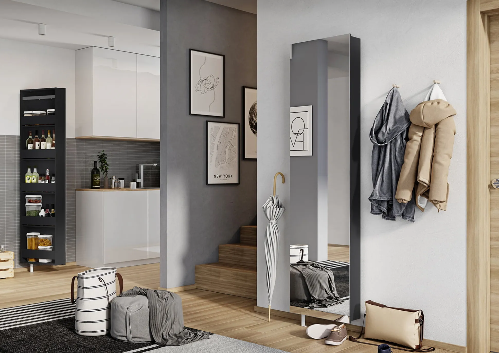 De kast is uitgevoerd in antraciet en kan aan de muur worden bevestigd voor extra stabiliteit. De meubel kan desgewenst in omgekeerde richting worden gemonteerd, waardoor je flexibiliteit hebt bij de plaatsing. Door de hoogte van 195 cm, breedte van 50 cm en diepte van 18 cm past deze kast ook in smalle ruimtes, terwijl de spiegeldeuren een ruimtelijk effect geven en de hal of badkamer optisch vergroten.