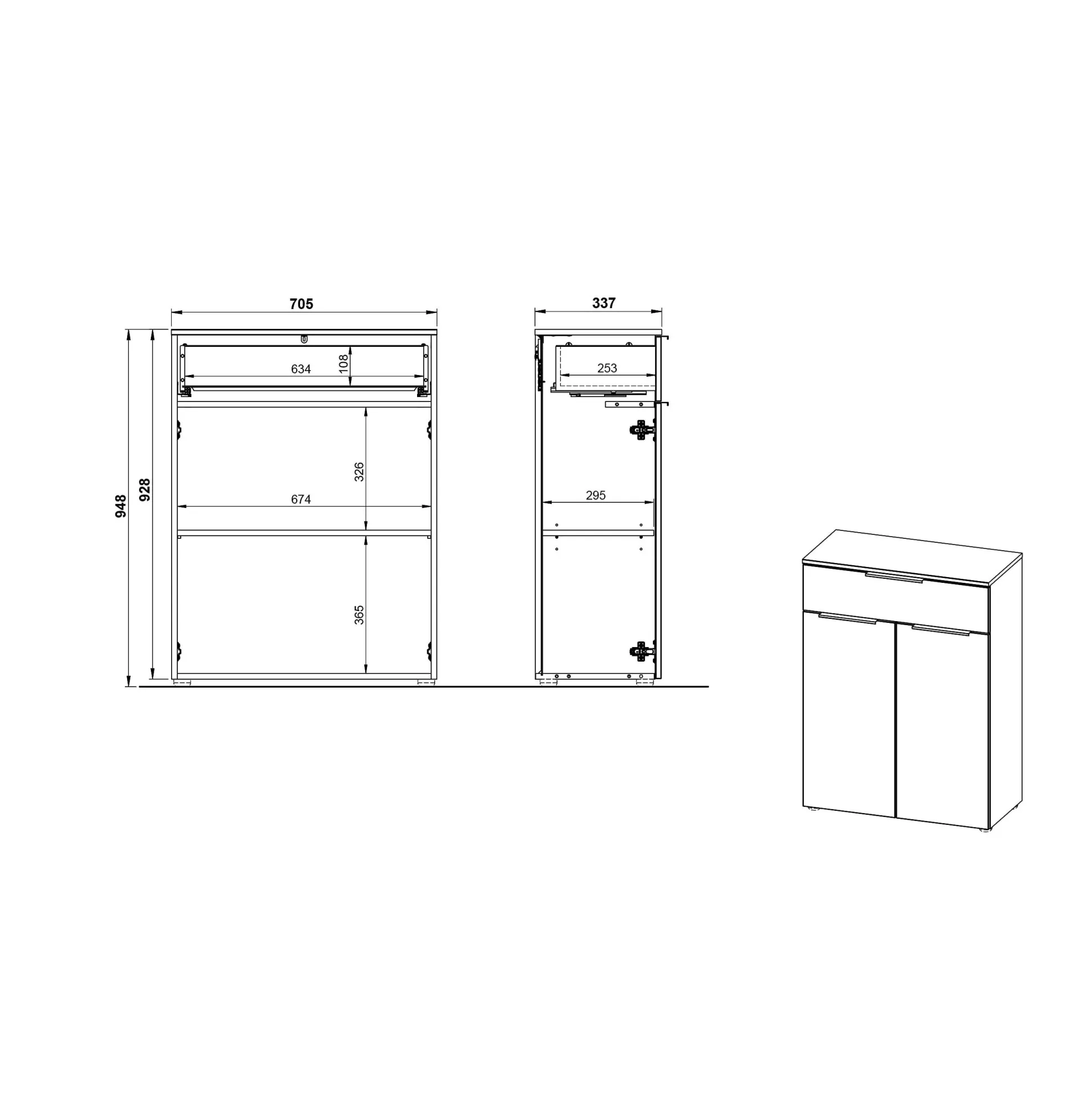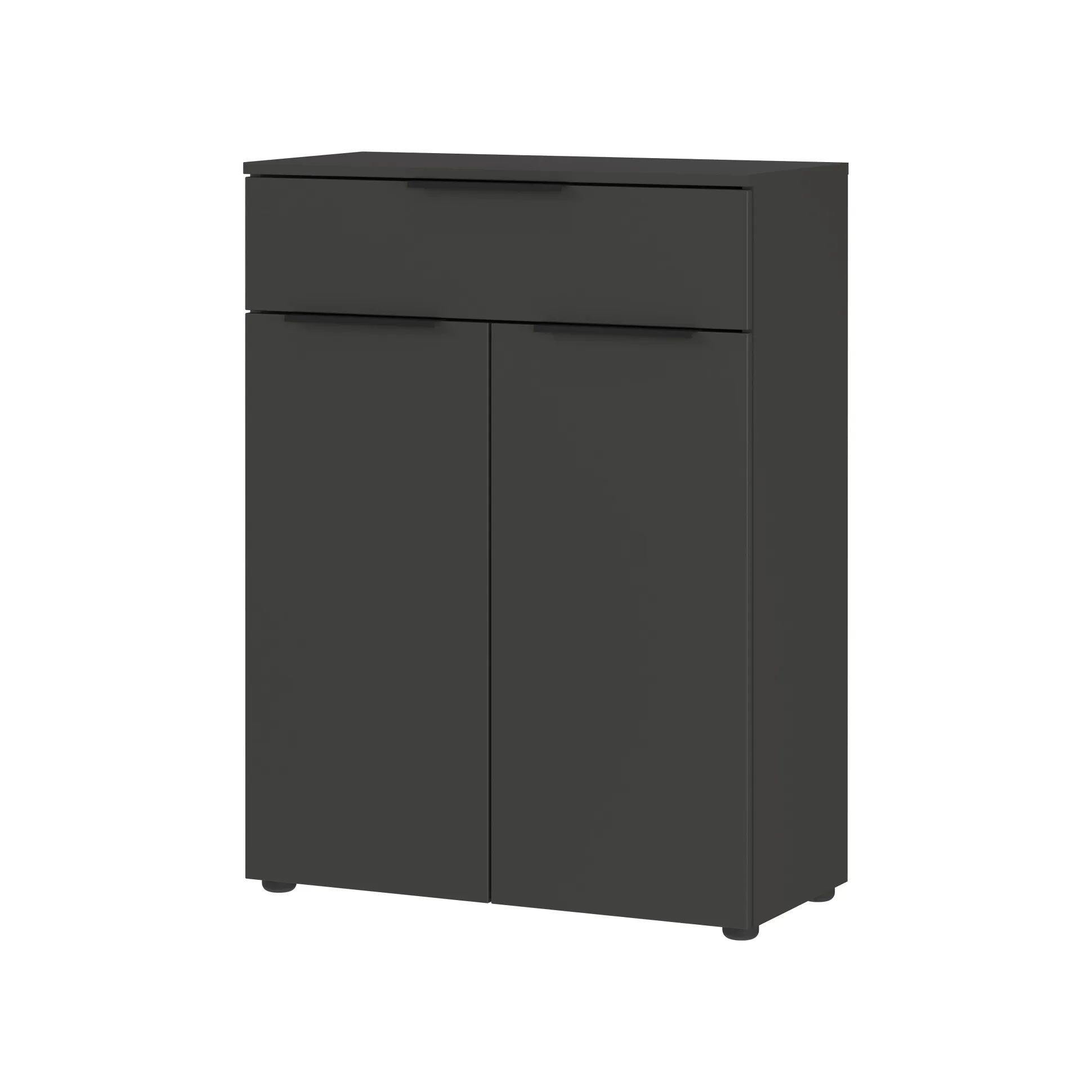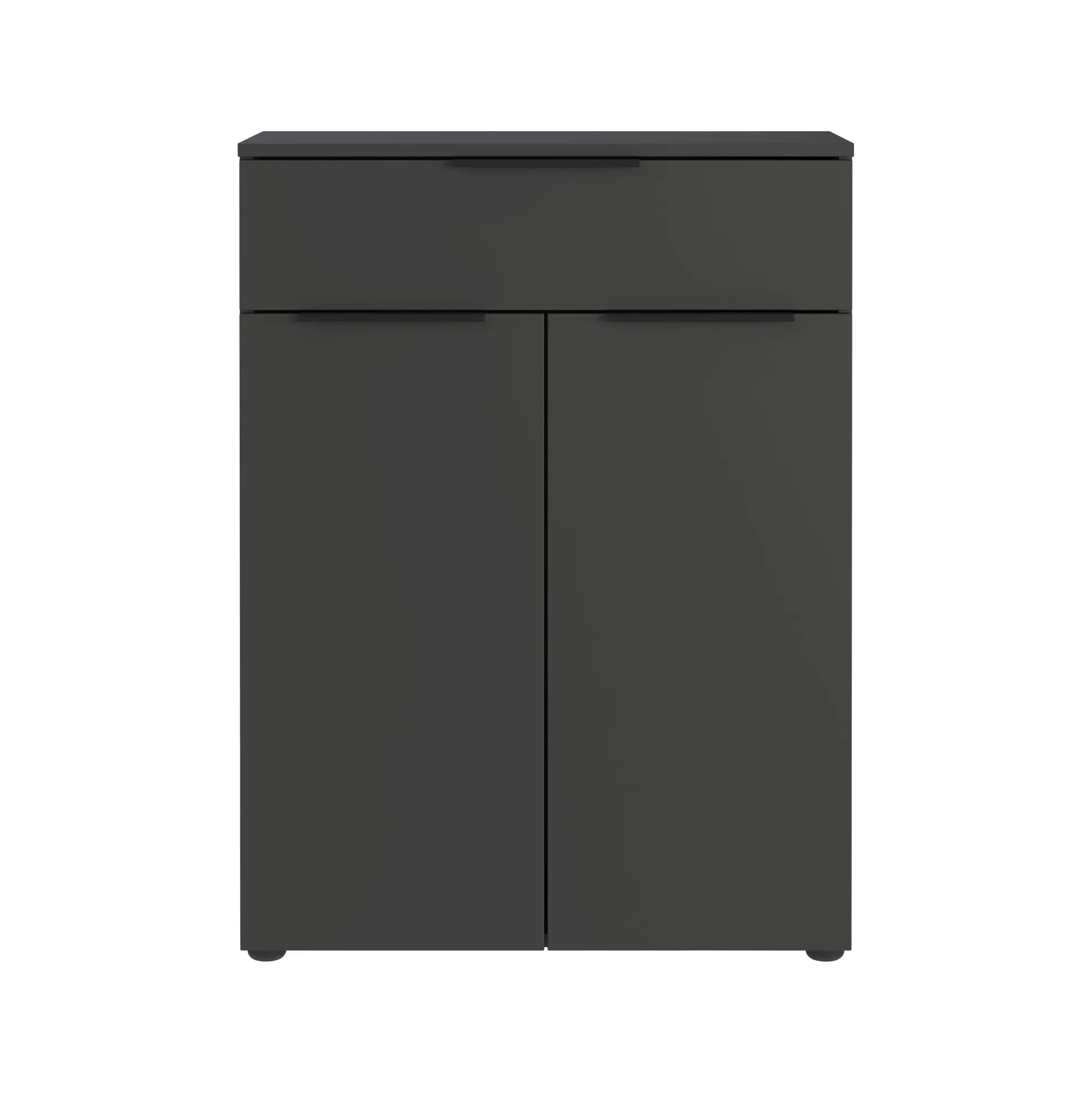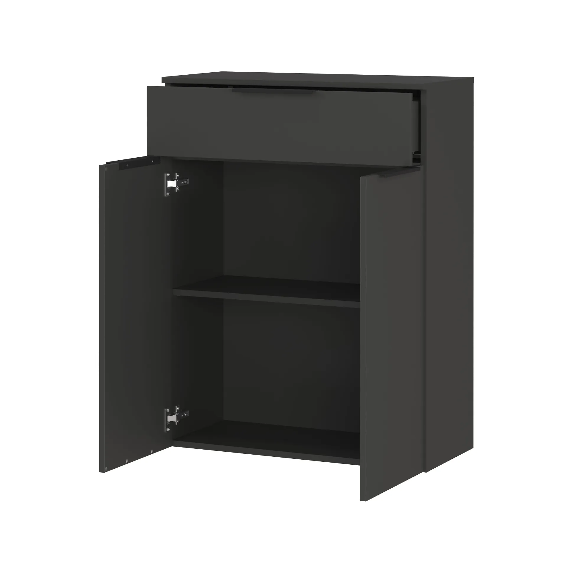 Deze ladekast met 1 lade (belastbaar tot 10 kg) en 2 deuren biedt voldoende opbergruimte. Achter de deuren vind je een verstelbare plank (belastbaar tot 10 kg). De kast is uitgevoerd in de kleur grafiet en heeft 3 handgrepen aan de voorzijde gemaakt van zwart gepoedercoat metaal. Daarnaast heeft de kast 4 zwarte kunststof meubelglijders. Je kunt deze kast zowel staand als hangend monteren. De oppervlaktecoating is krasbestendig en duurzaam, en de randen van de kast zijn bestand tegen stoten en impact. Zowel de lade als de deuren sluiten langzaam, zacht en geruisloos dankzij geïntegreerde dempers. Dit meubelstuk is vervaardigd in Duitsland.