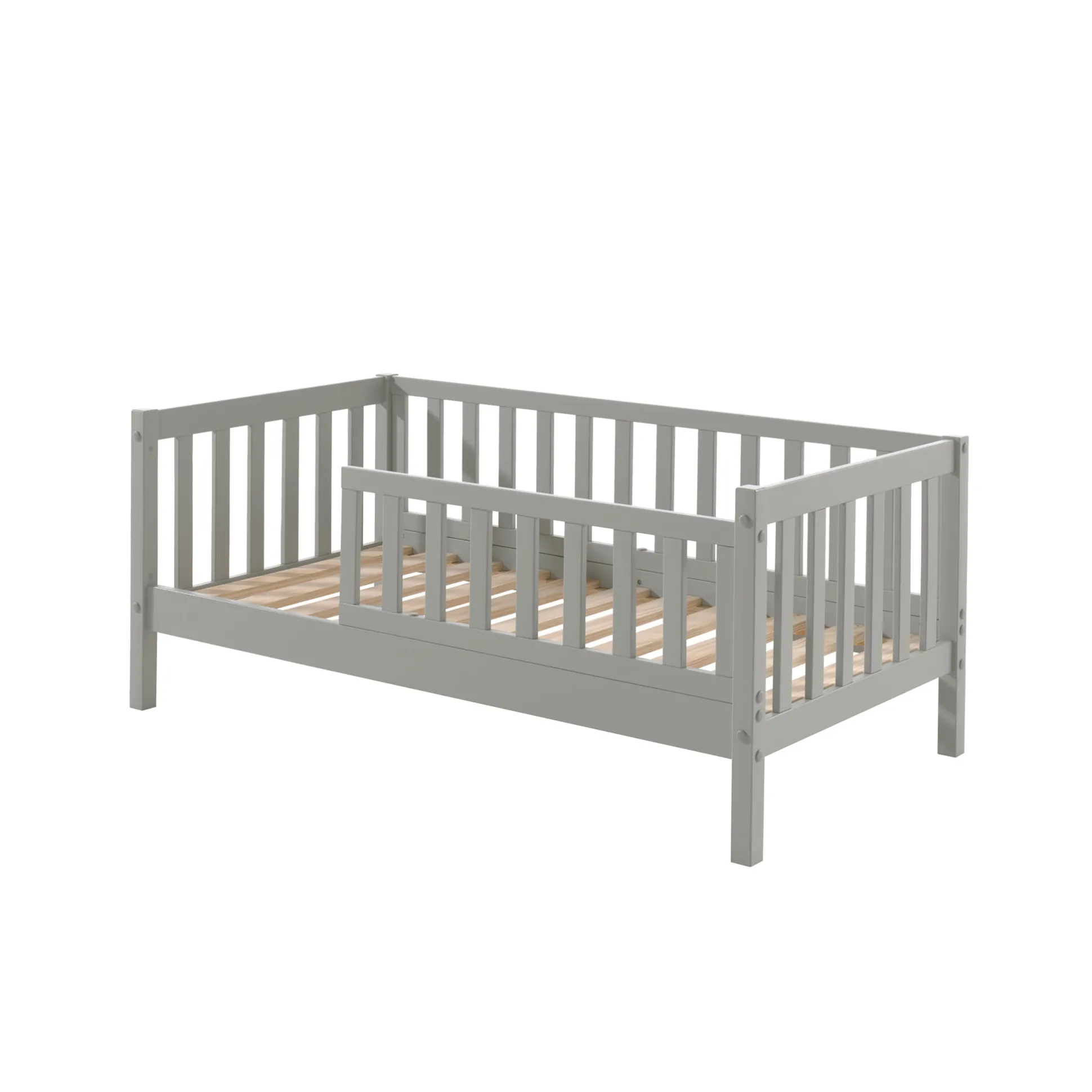 Dit kwalitatieve peuterbed is vervaardigd uit massief grenen en is grijs gelakt. Door de extra hoge horizontale zijkanten rondom is je kind verzekerd van een veilige nachtrust. De lattenbodem is inclusief. In het bed past een matras van 70×140 cm. Verkrijgbaar in verschillende uitvoeringen.