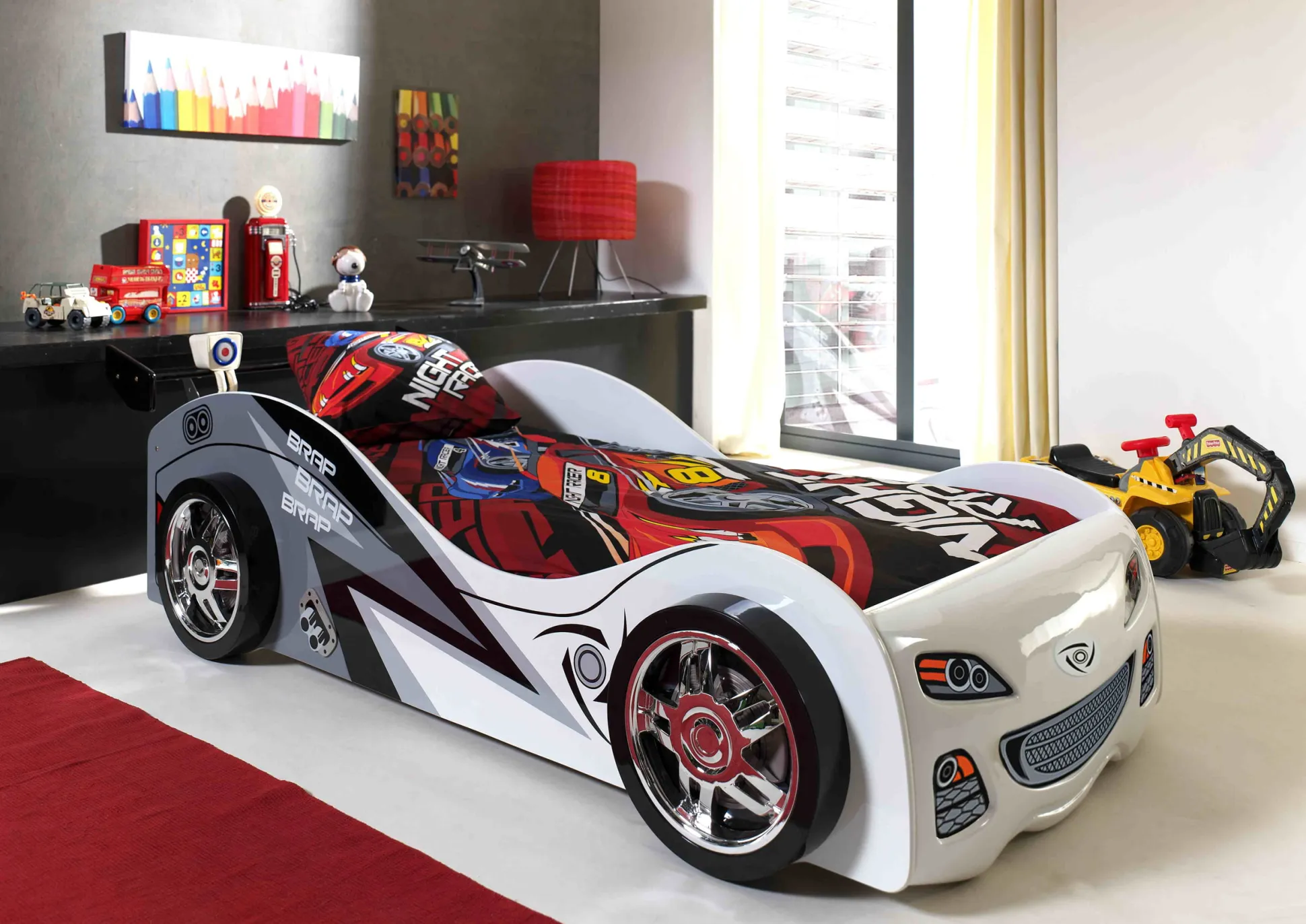 Met dit sportieve autobed heb je een bed die afgewerkt is met een stoere raceauto print compleet met stoere wielen en een racevleugel die helemaal bij een kind past die van raceauto’s houdt. Tevens heeft het bed een verhoogde rand die ervoor zorgt dat je kind veilig in bed kan slapen. Het bed is vervaardigd uit hoogwaardig MDF. In het bed past elke matras van 90 x 200cm uit de collectie van huisenthuis.nl.