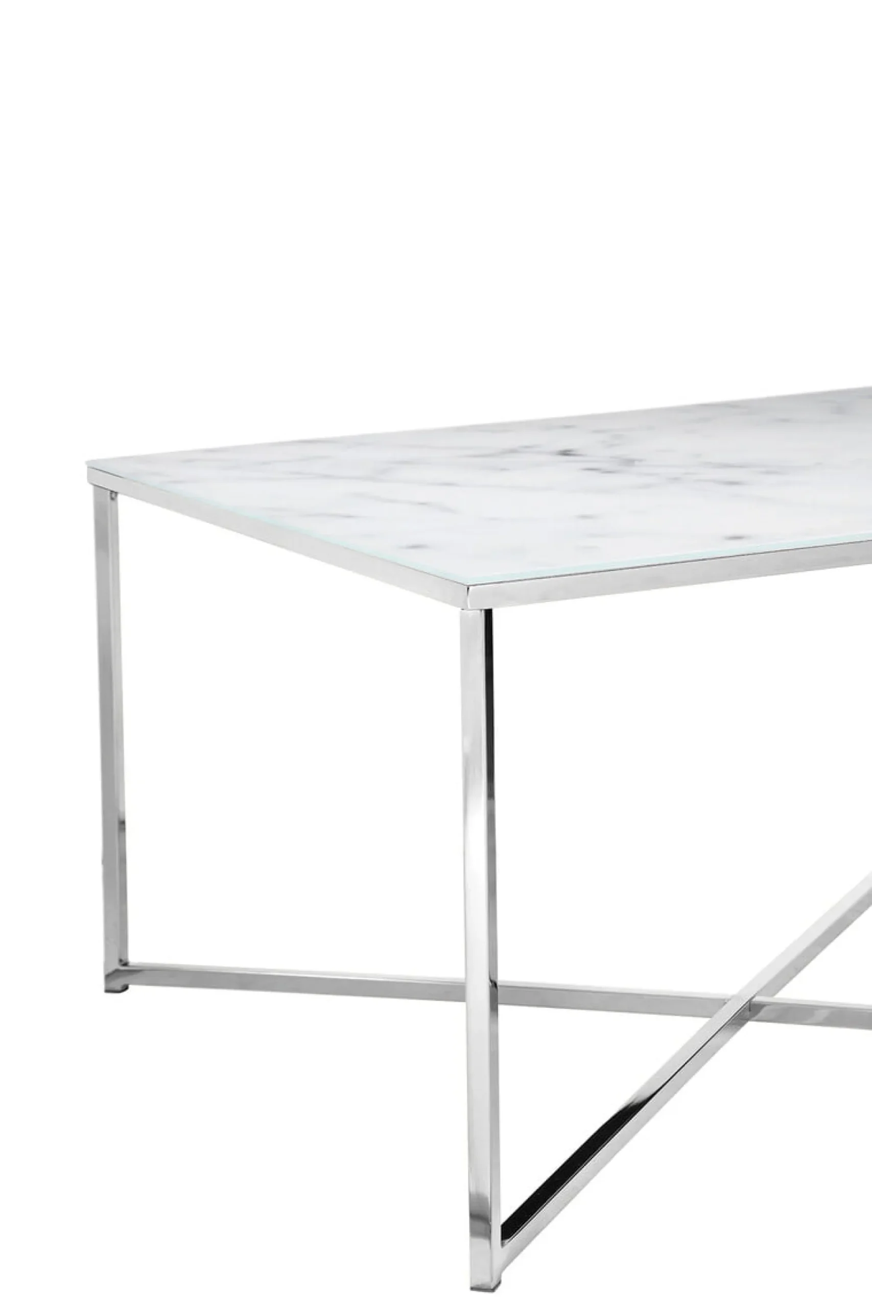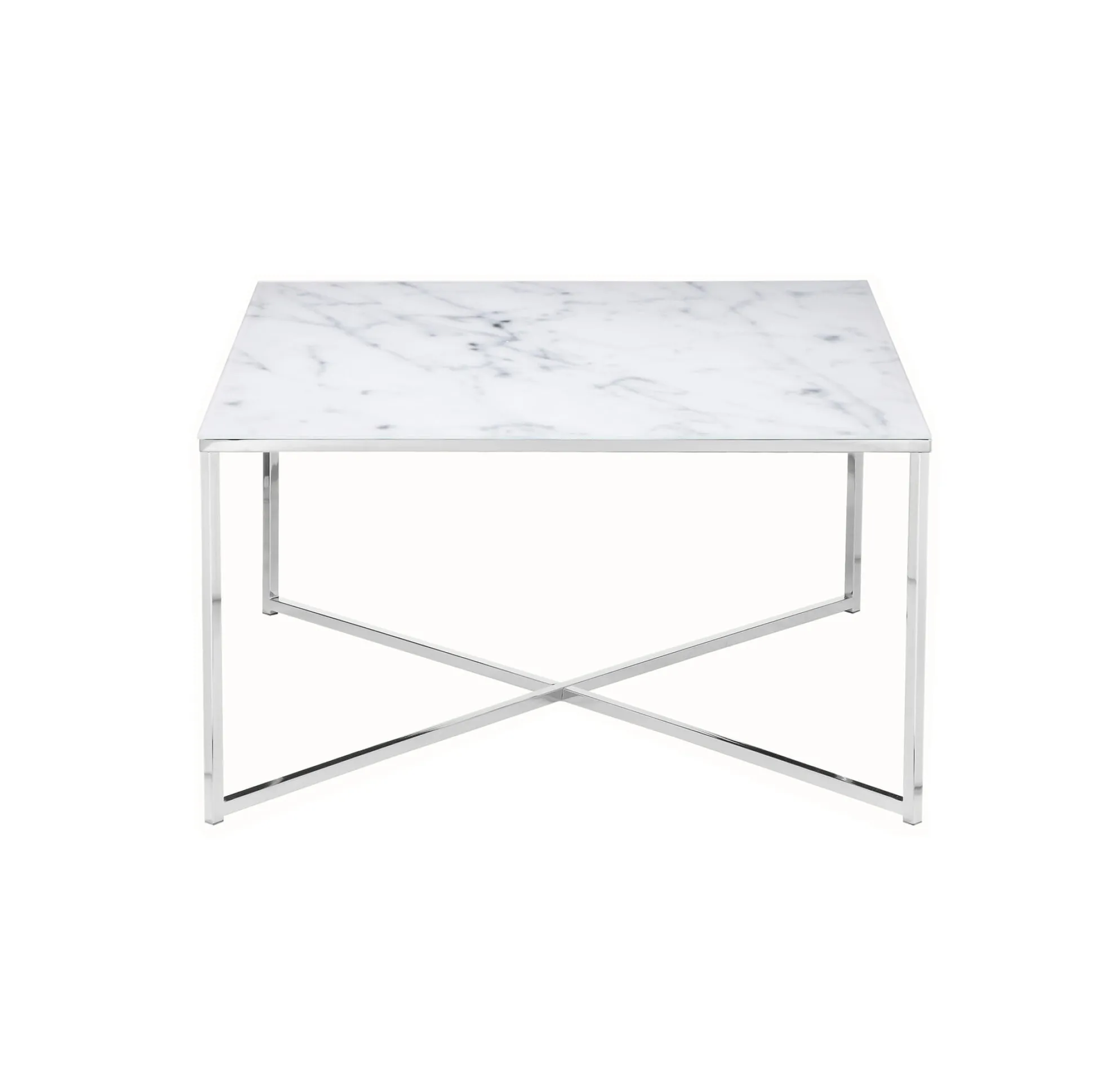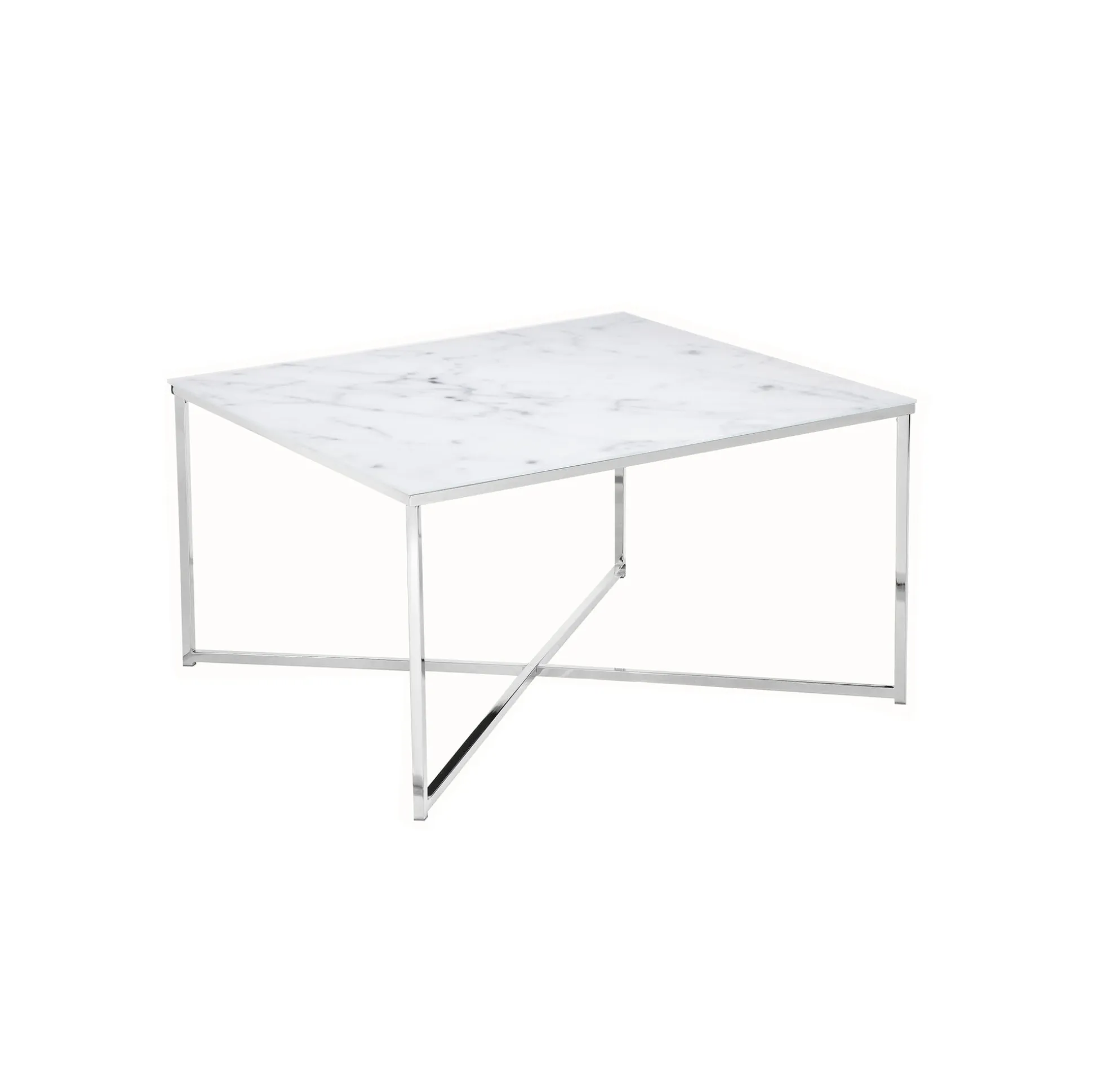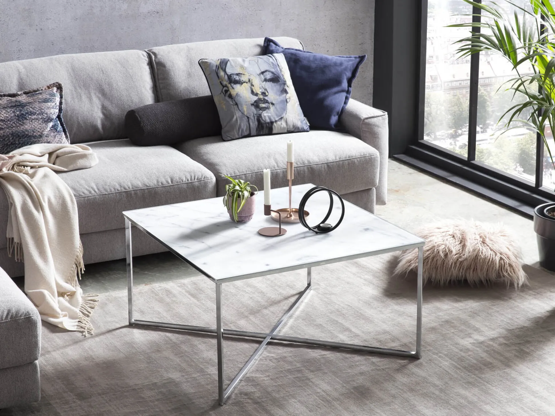 Deze vierkante salontafel is gemakkelijk te plaatsen in de woonkamer als salon- of bijzettafel. De tafel heeft een glazen platen van 6 mm met daaronder een mooie marmer look afwerking. Op de tafel kun je gemakkelijk een kopje koffie of de afstandsbediening kwijt tezamen met enkele leuke accessoires.