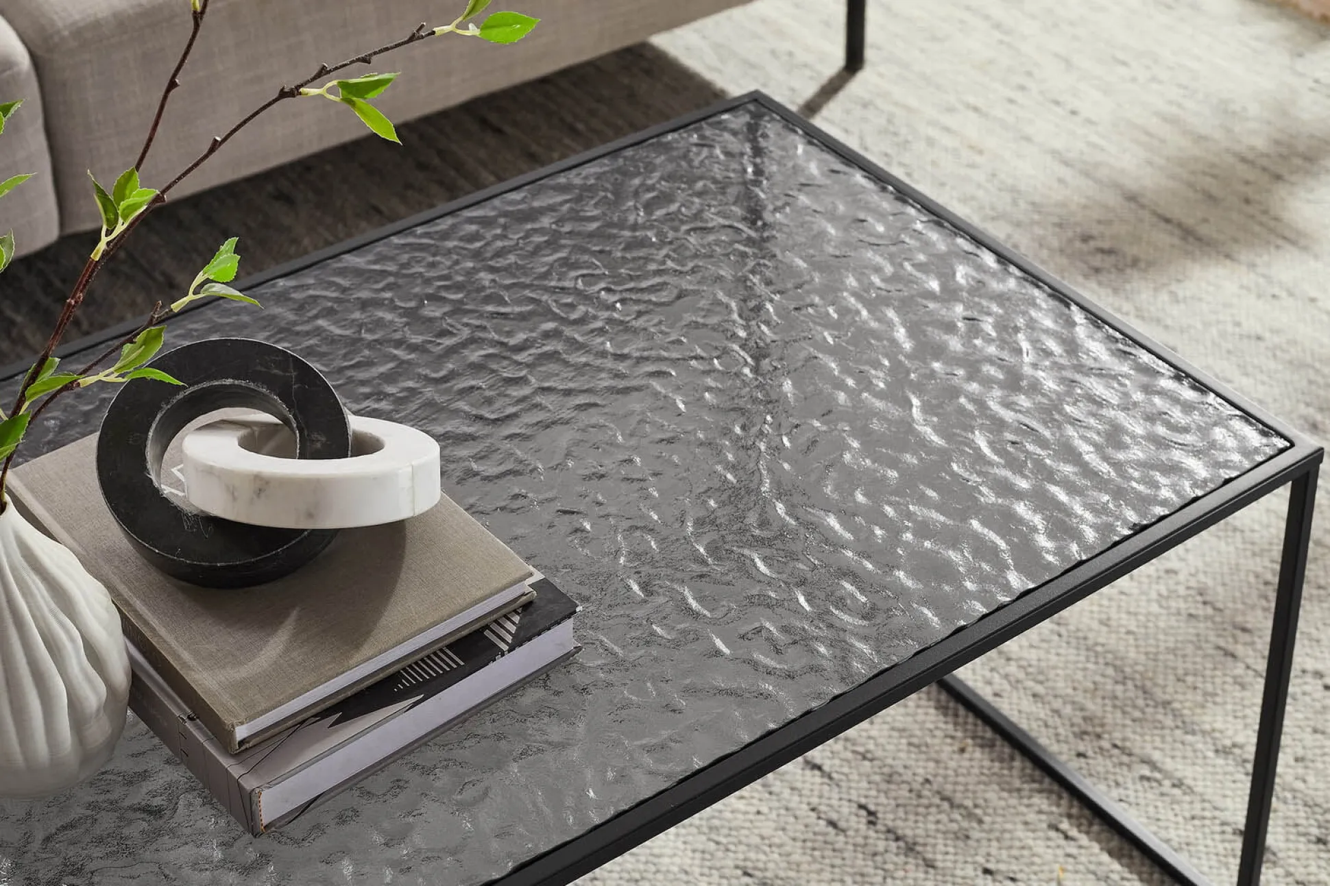 Een langwerpige salontafel met een gestructureerd glazen blad en een minimalistisch metalen frame. Perfect voor een chique en moderne uitstraling in de woonkamer.