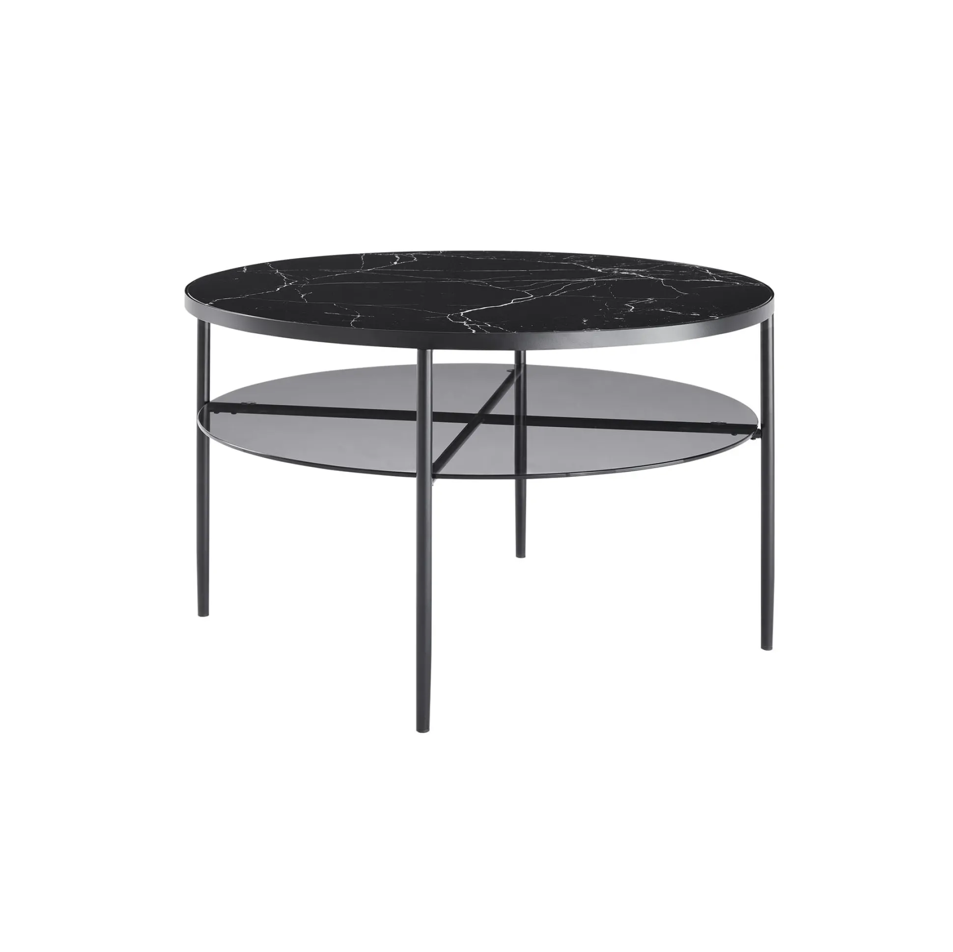 Een stijlvolle ronde salontafel met twee bladen voor extra functionaliteit. Het bovenblad heeft een luxe marmerprint, terwijl de onderste plank van getint glas een subtiele, moderne uitstraling geeft.
