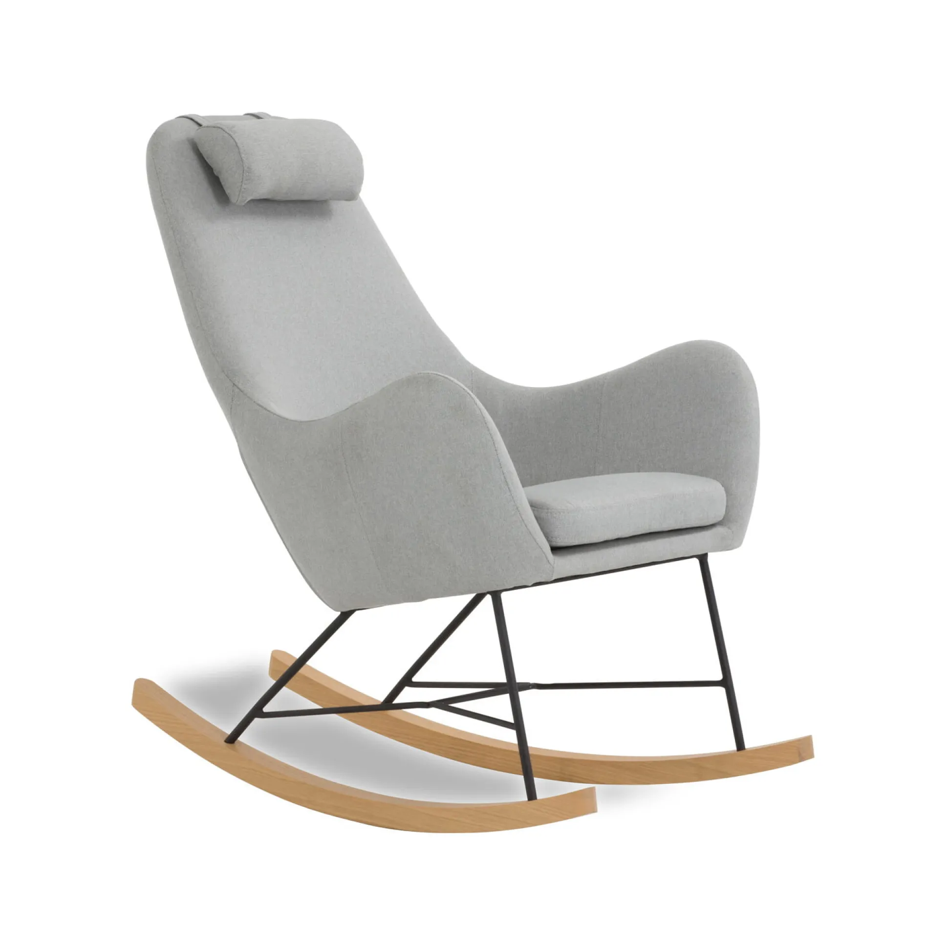 Ervaar ultiem comfort met deze elegante schommelstoel. Het zwarte, gelakte metalen frame op de gebogen eikenhouten latten geeft de stoel een moderne uitstraling, terwijl de zachte kussens en armleuningen extra luxe en ondersteuning bieden. De stoel is bekleed met een duurzame polyester stof en gevuld met polyether schuim voor een comfortabele zitervaring.