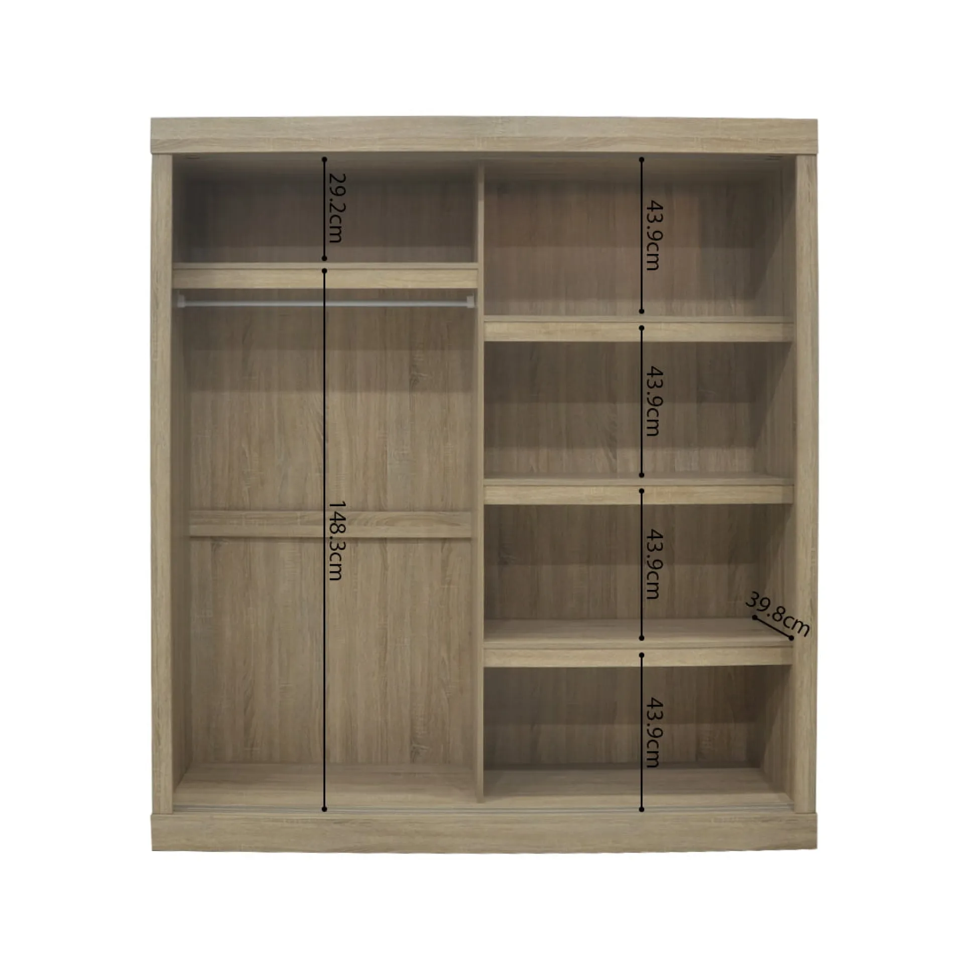 De Schuifdeurkast Graham Sonoma – Spiegel voegt de perfecte combinatie van functionaliteit en stijl toe aan je slaapkamer. Met een breedte van 182,5 cm, een hoogte van 197,5 cm en een diepte van 52,5 cm, biedt deze kast voldoende opbergruimte voor al je kleding en accessoires. Achter de linkerdeur van de kast vind je een handige indeling met een legplank en een kledingroede, ideaal voor het netjes opbergen van je kleding, zoals jurken, overhemden en jassen. Er is zelfs ruimte onderin voor bijvoorbeeld je schoenen.