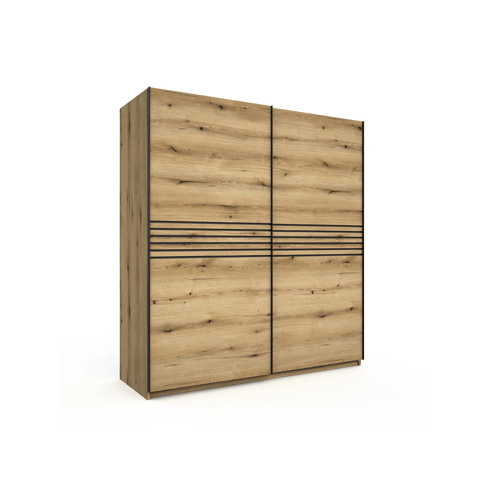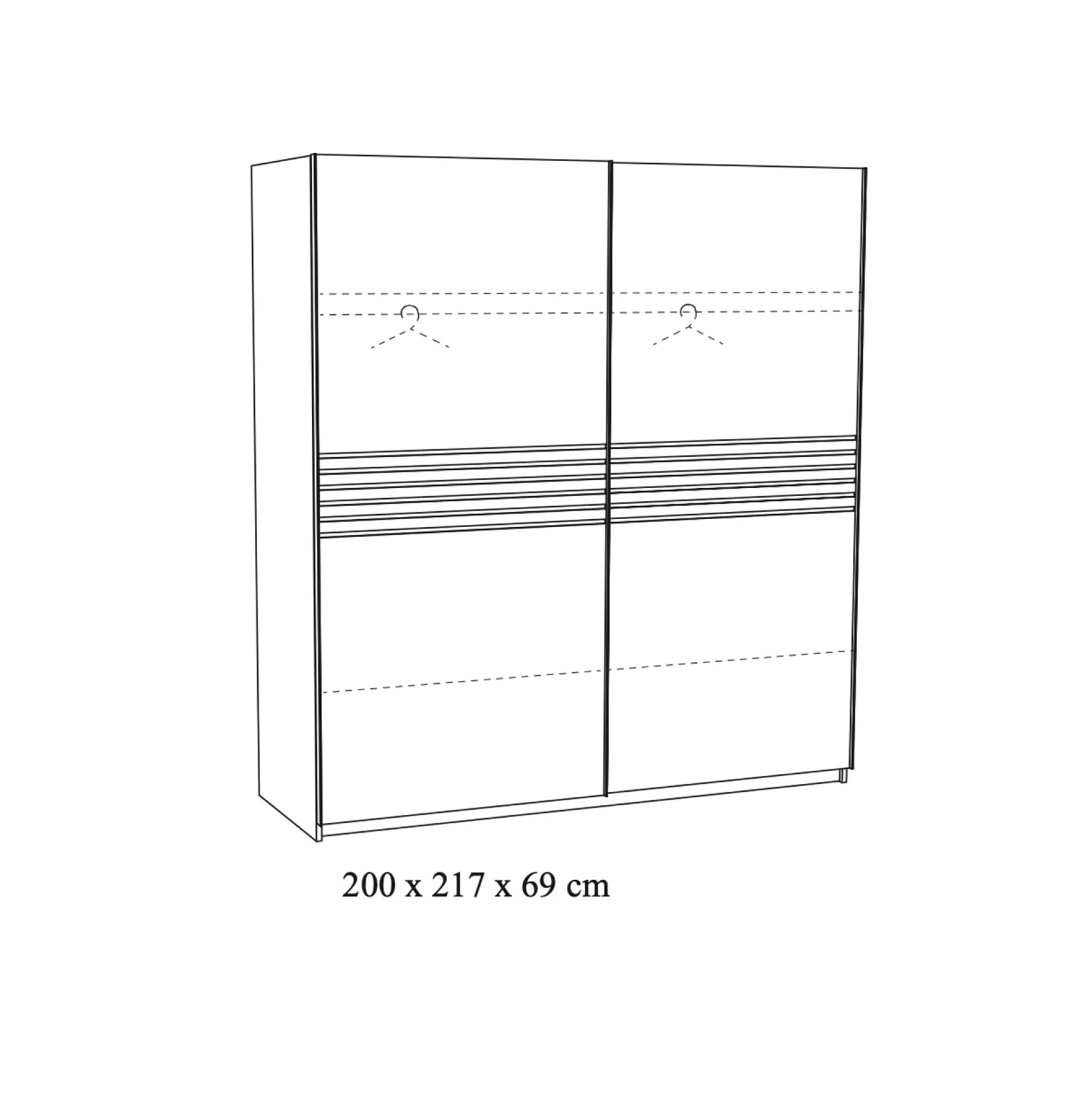 Met een breedte van 200 cm biedt de schuifdeurkast Mekong in eiken royale opbergruimte voor kleding en accessoires. De twee schuifdeuren zorgen voor een ruimtebesparende en strakke uitstraling. De binnenkant is voorzien van meerdere legplanken en kledingroedes, waardoor je eenvoudig al je spullen georganiseerd houdt.