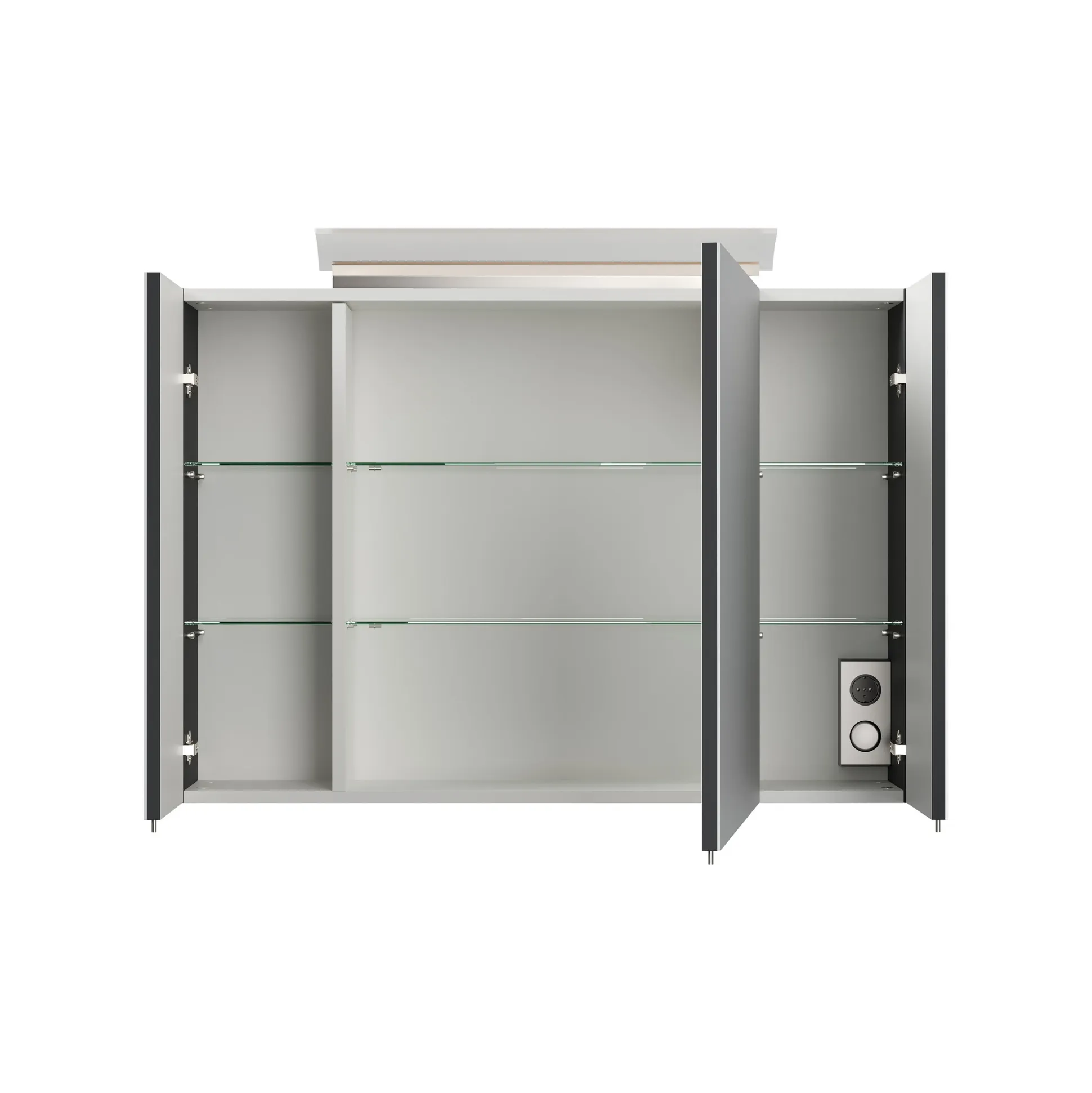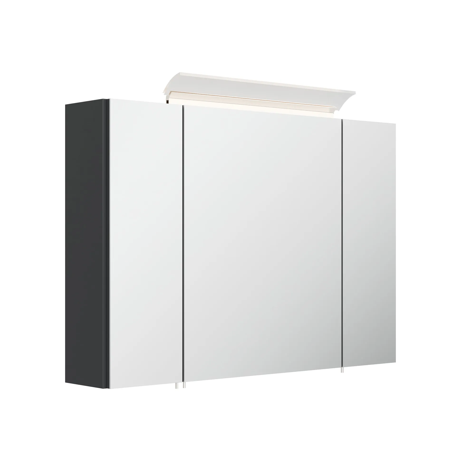 De Spiegelkast Calais Grafiet 90 cm biedt een moderne en functionele badkameroplossing, ontworpen in Duitsland. Vervaardigd uit een degelijke spaanplaat en afgewerkt met een matte grafiet Softtouch-coating, beschikt deze kast over 2 spiegeldeuren en 6 flexibel inzetbare glazen planken voor optimale opbergruimte. De soft-close deuren en laden zorgen voor een stille werking. De afmetingen zijn 90 x 62 x 17 cm.