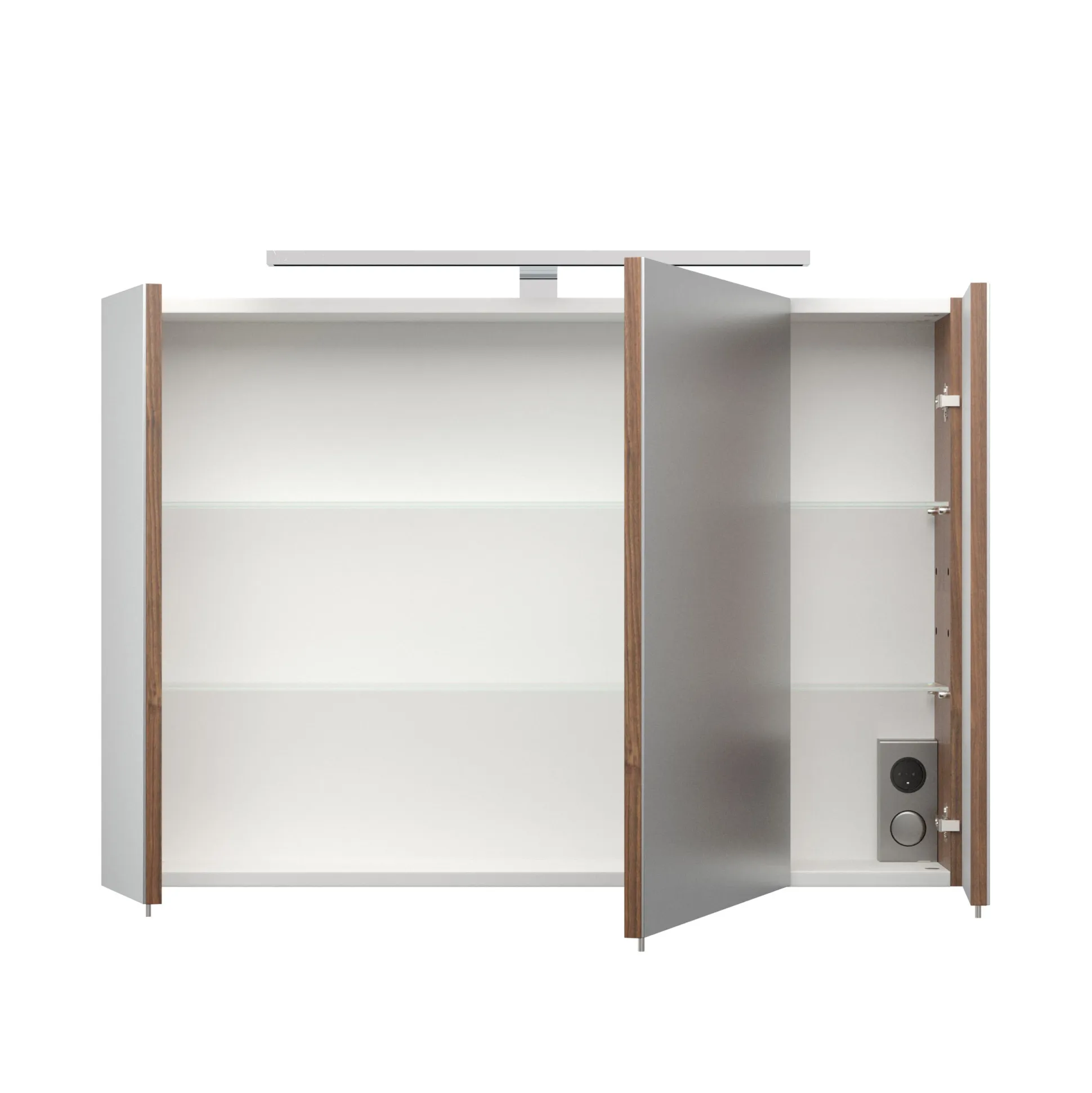 Deze spiegelkast heeft een klassieke uitstraling en is toepasbaar in veel omstandigheden. De spiegelkast is voorzien van een 8 watt chroomkleurige ledlamp welke in elke omstandigheid goed neutraal wit licht geeft. Achter de 3 deuren, voorzien van soft-close, bevinden zich 2 glazen planken om al je spullen op te bergen, ook bevindt zich hier de aan/uit knop in combinatie met een stopcontact. Deze kast is afgewerkt met een melamine waardoor deze goed schoon te maken is. De kast is 90cm breed, 62cm hoog en 17cm diep en is te verkrijgen in het wit, eiken, walnoot en antraciet.