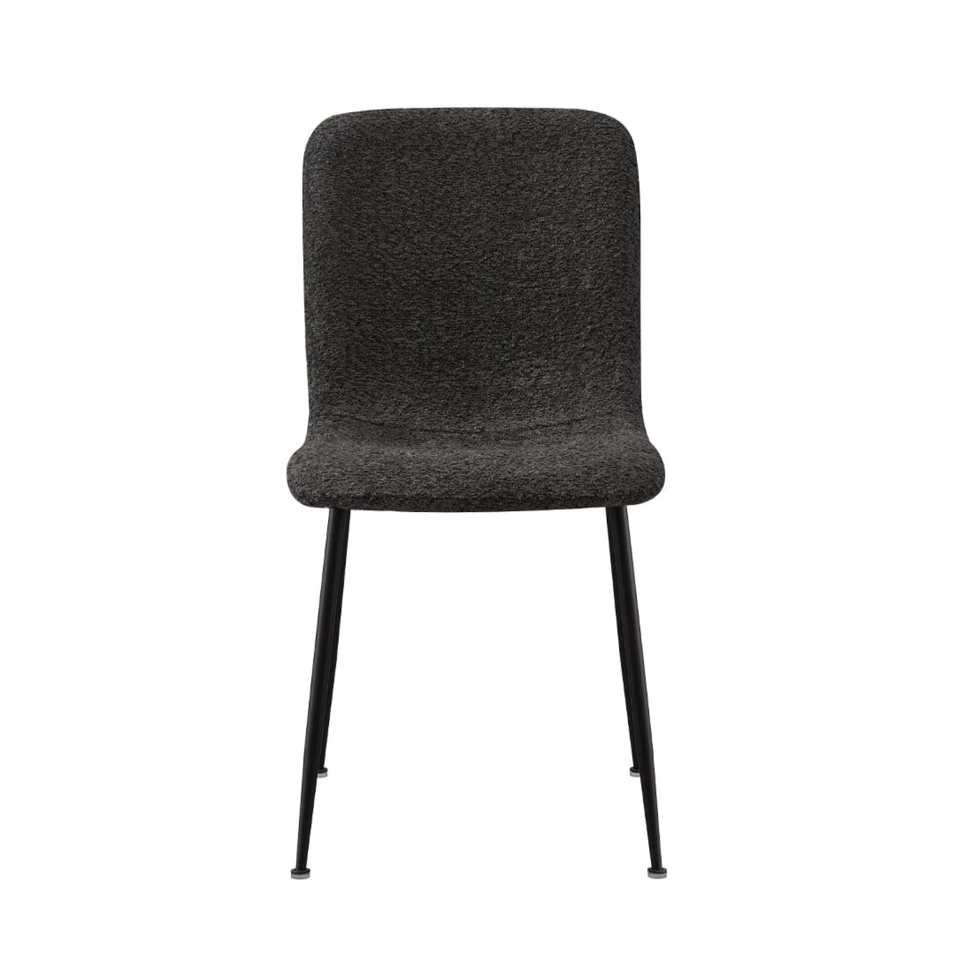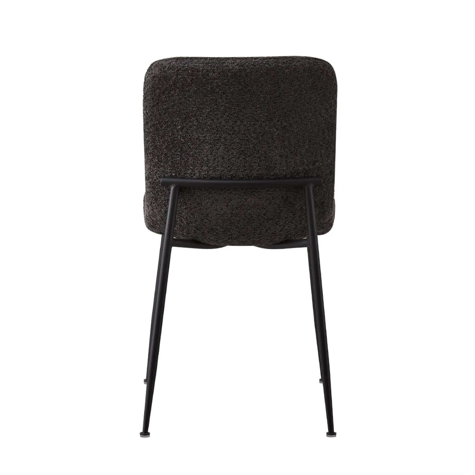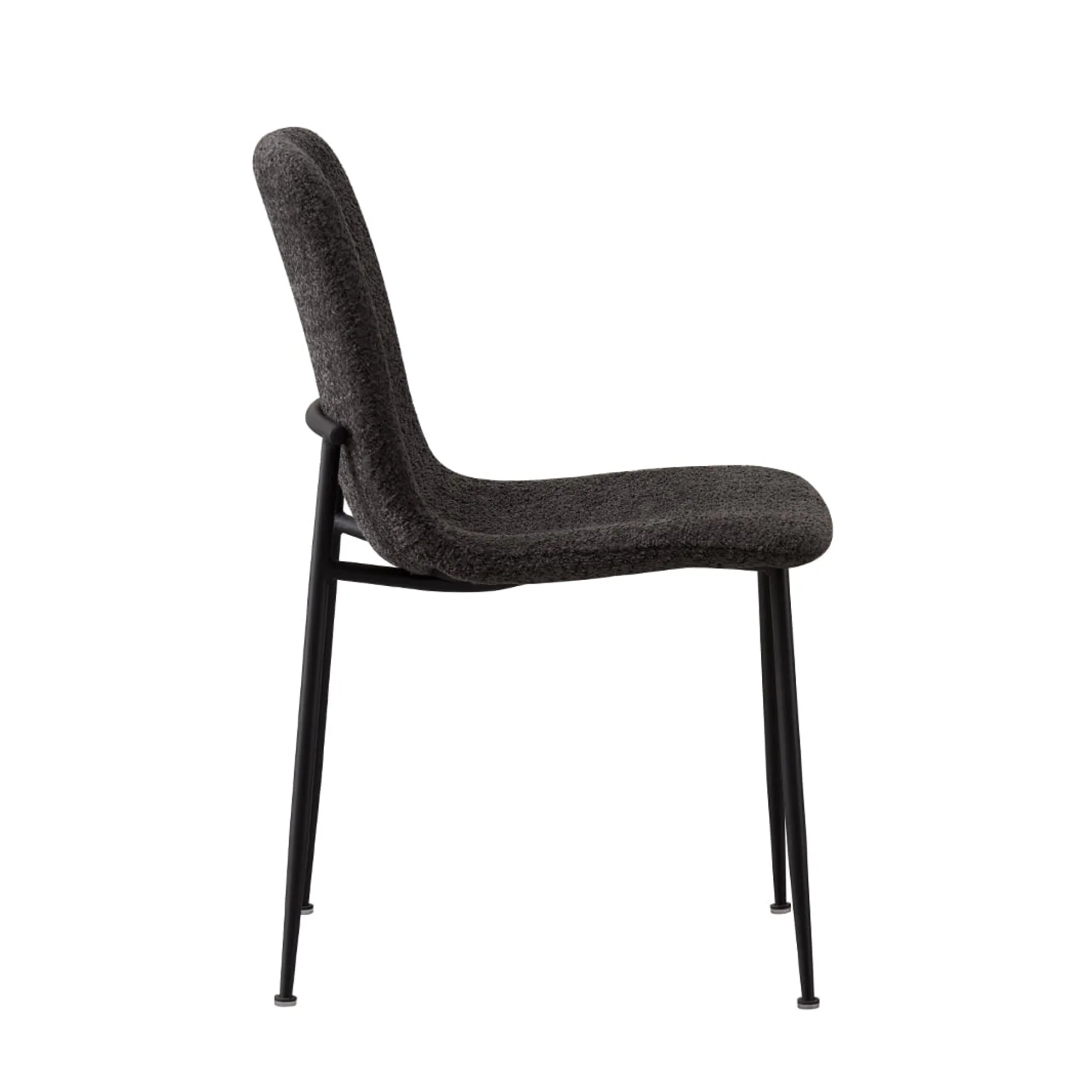 Deze trendy eetkamerstoel heeft metalen ronde zwarte poten en staat stevig op de grond. De stoel heeft een goed zitcomfort en is voorzien van een mooie Bouclé stoffering. Bouclé is een stof dat bestaat uit geweven patronen, draden en lussen van verschillende stoffen, hierdoor ontstaat een grovere structuur welke zacht aanvoelt. Verkrijgbaar in verschillende moderne kleuren waardoor deze gemakkelijk in je interieur plaats neemt. De stoel heeft een zithoogte van 47,5 centimeter en een zitdiepte van 40 centimeter.