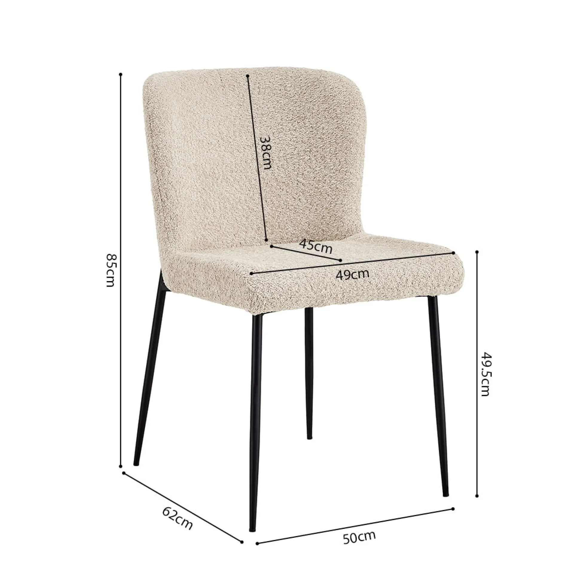Deze trendy eetkamerstoel heeft metalen ronde zwarte poten en staat stevig op de grond. De stoel heeft een goed zitcomfort en is voorzien van een mooie Bouclé stoffering. Bouclé is een stof dat bestaat uit geweven patronen, draden en lussen van verschillende stoffen, hierdoor ontstaat een grovere structuur welke zacht aanvoelt. Verkrijgbaar in verschillende moderne kleuren waardoor deze gemakkelijk in je interieur plaats neemt. De stoel heeft een zithoogte van 49,5 centimeter en een zitdiepte van 45 centimeter.