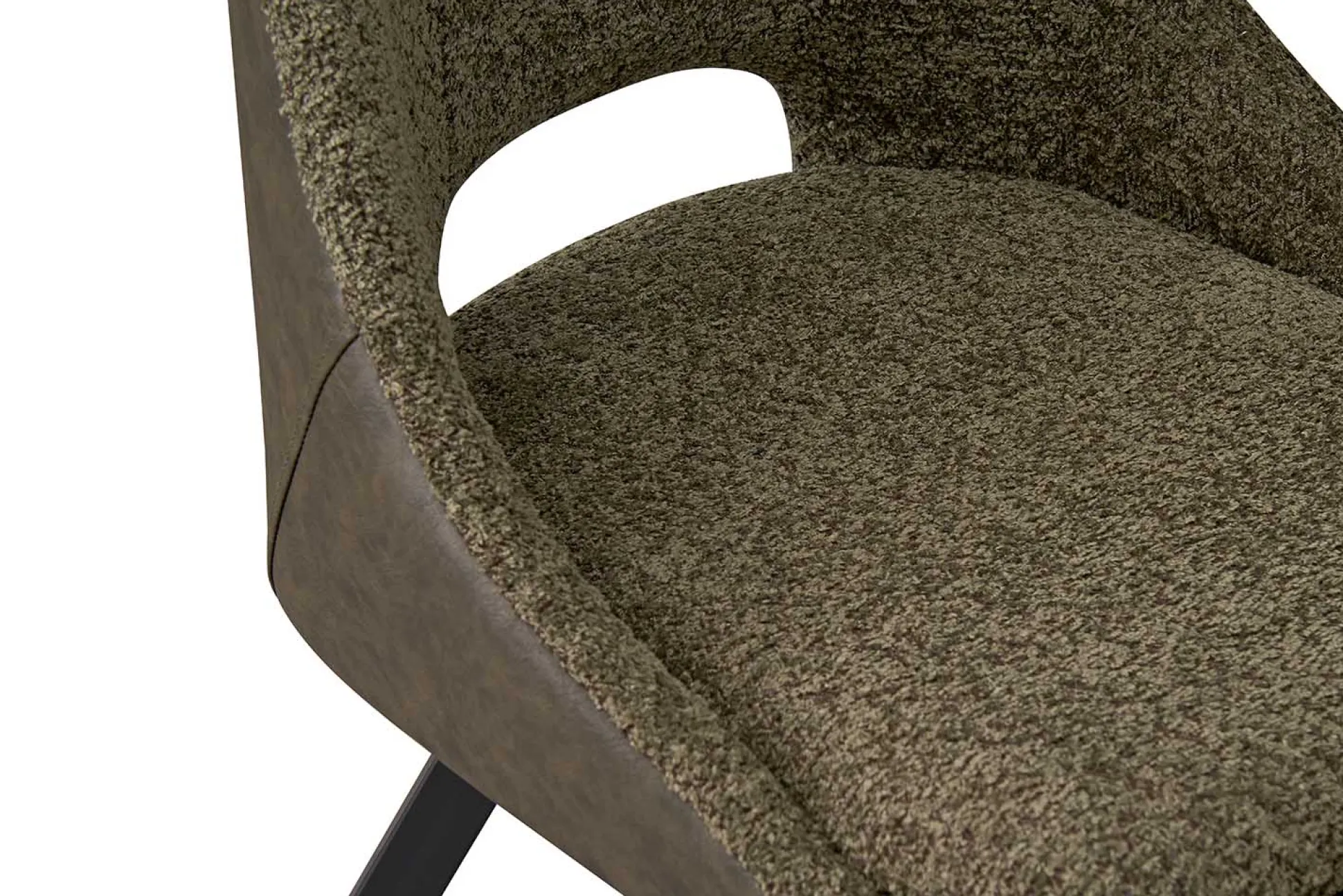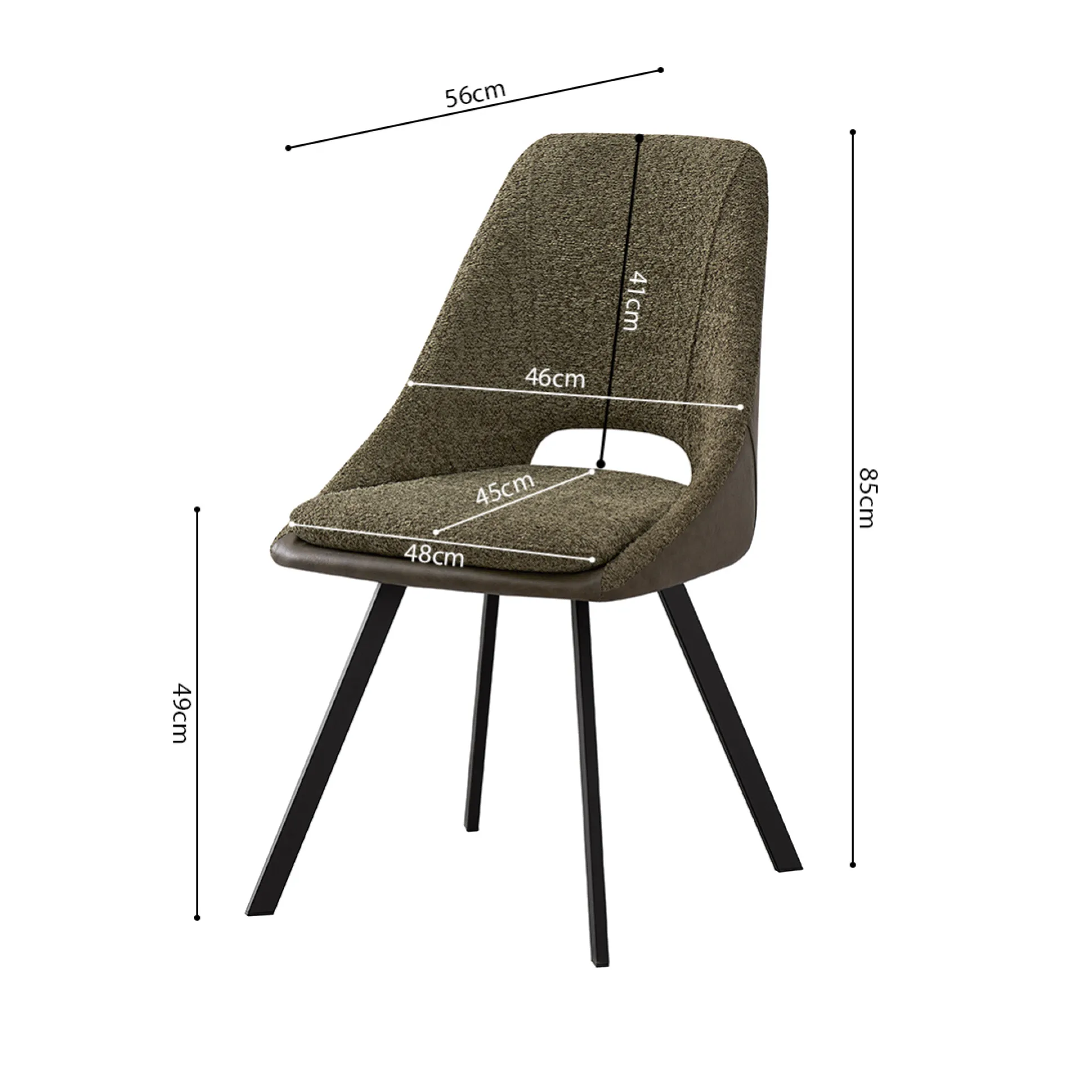 Deze trendy eetkamerstoel heeft metalen rechthoekige zwarte poten en staat stevig op de grond. De stoel heeft een goed zitcomfort, het zitvlakte is voorzien van een mooie Bouclé stoffering, de rugleuning is uitgevoerd in kunstleder. Bouclé is een stof dat bestaat uit geweven patronen, draden en lussen van verschillende stoffen, hierdoor ontstaat een grovere structuur welke zacht aanvoelt. Verkrijgbaar in verschillende moderne kleuren waardoor deze gemakkelijk in je interieur plaats neemt. De stoel heeft een zithoogte van 49 centimeter en een zitdiepte van 45 centimeter.