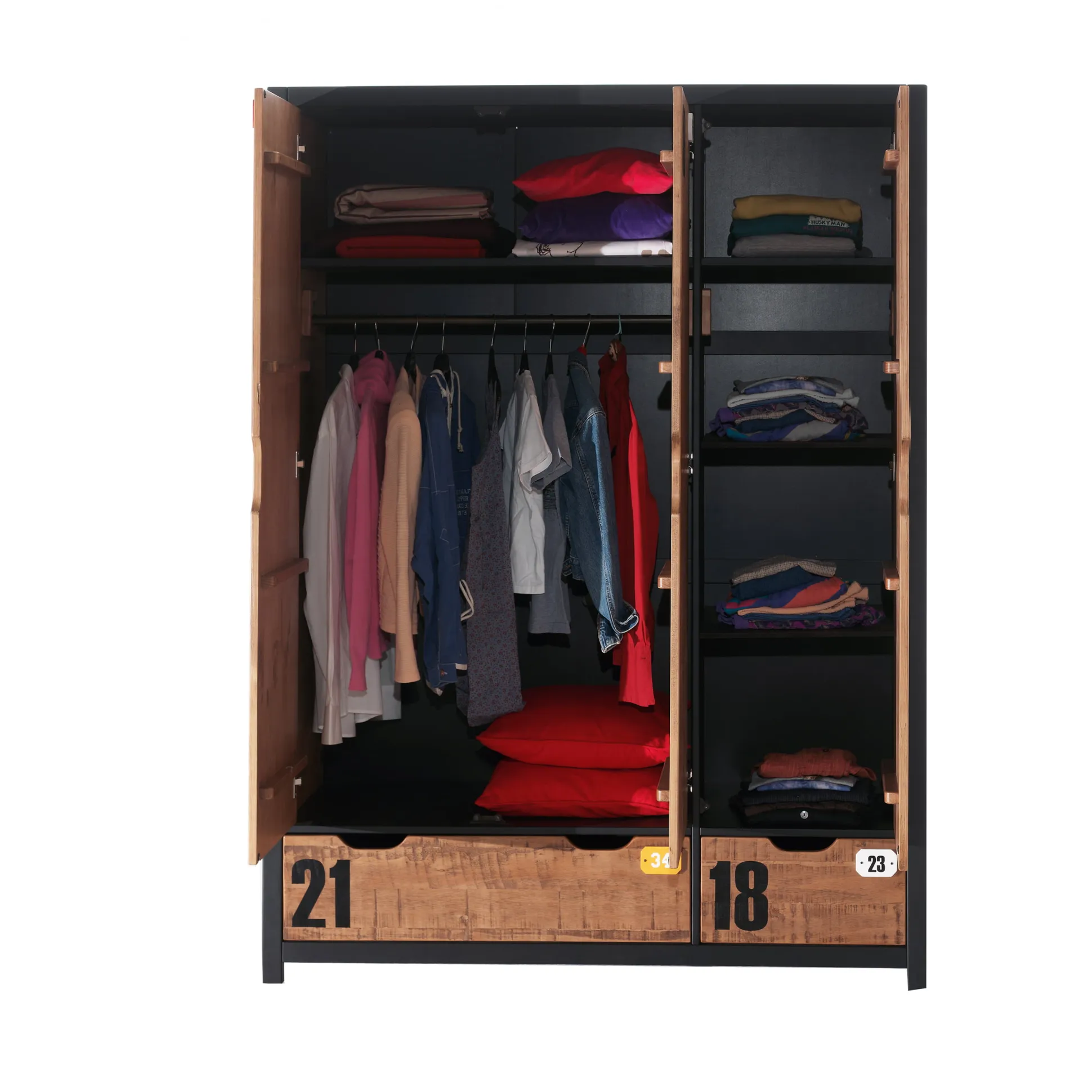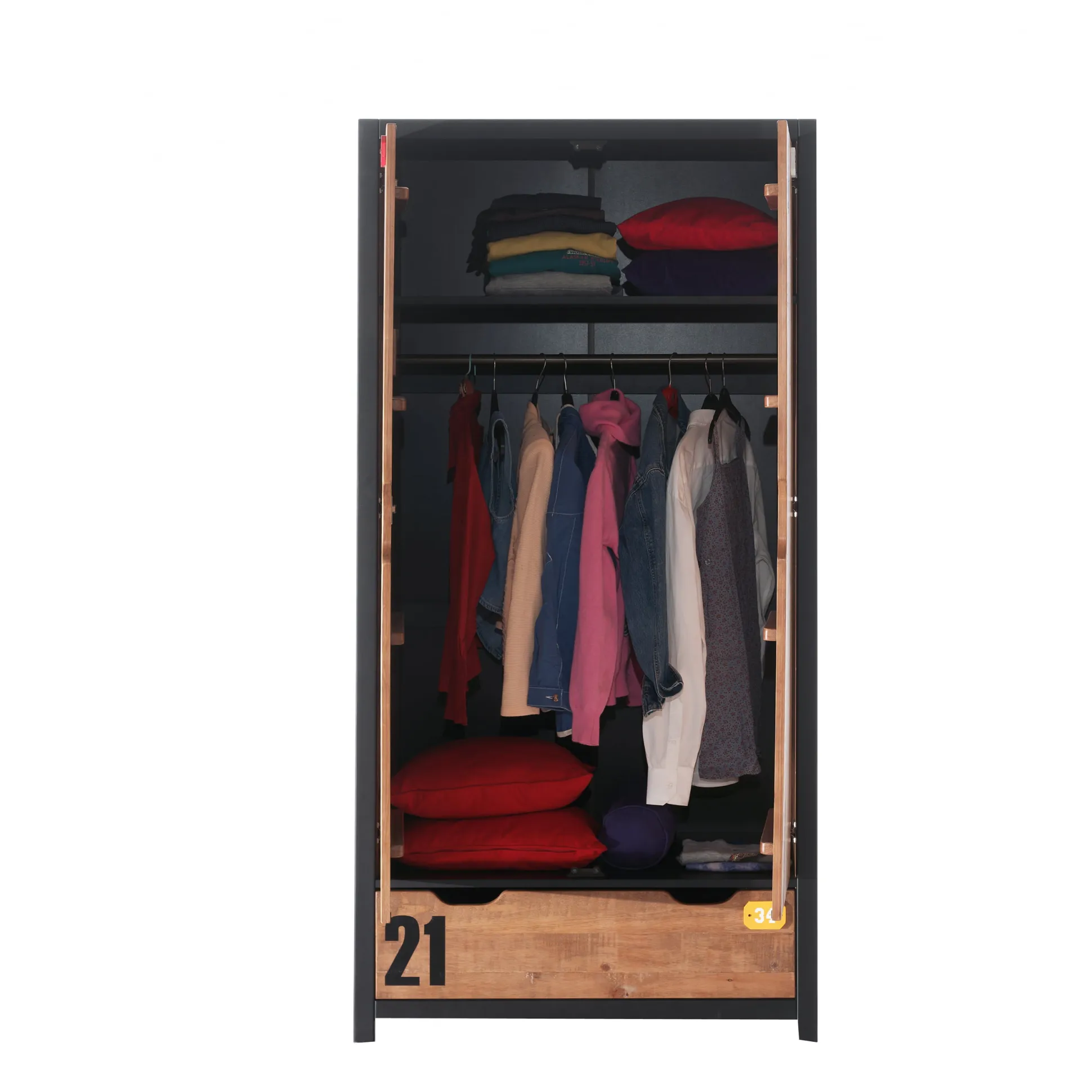 Deze 2-deurskast heeft achter de deuren onder en boven een legplank. Onder de bovenste legplank is een kledingroede voor het ordelijk weghangen van al je kledij. In de brede lade onder heb je veel ruimte voor al je andere spulletjes.