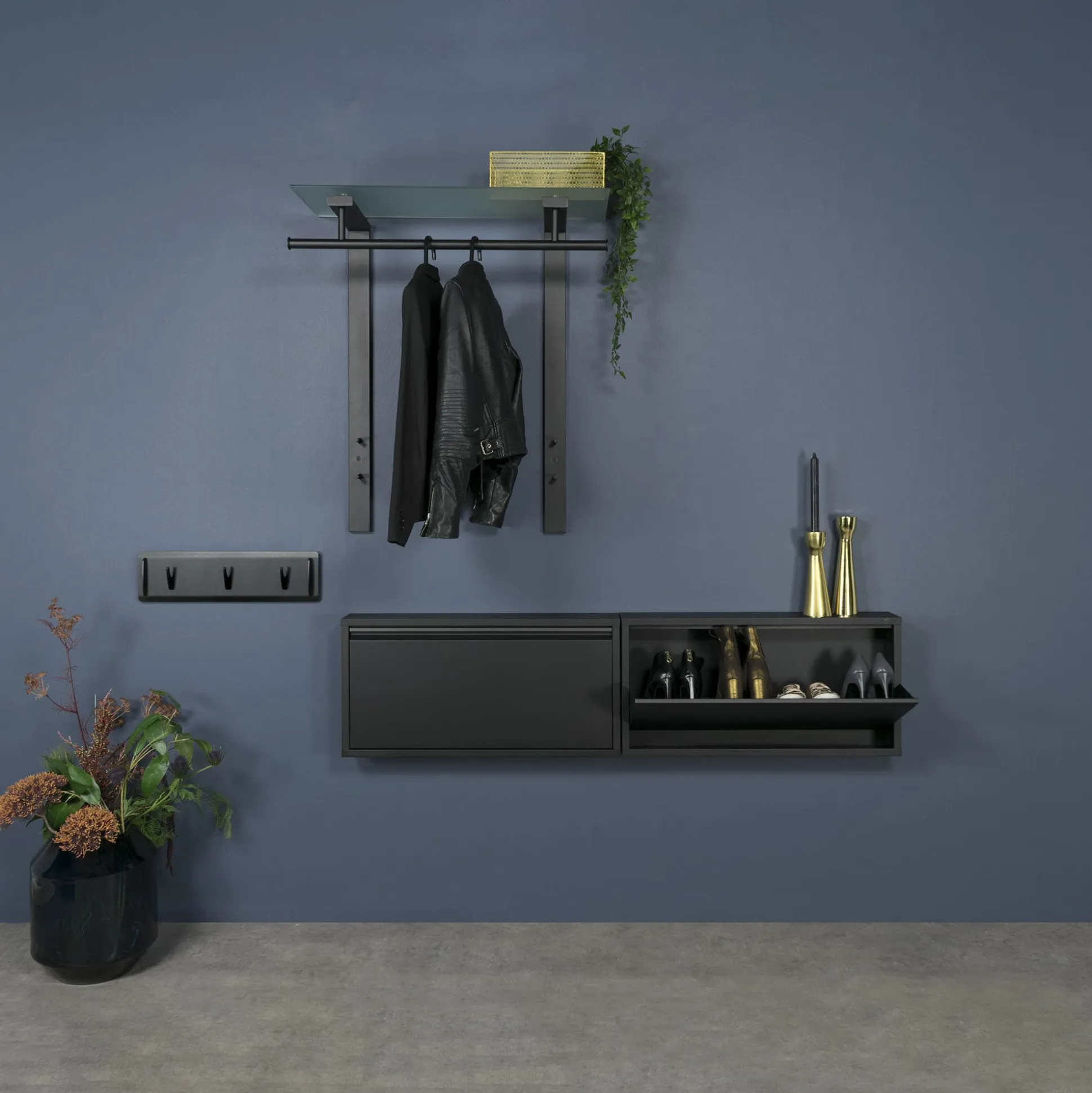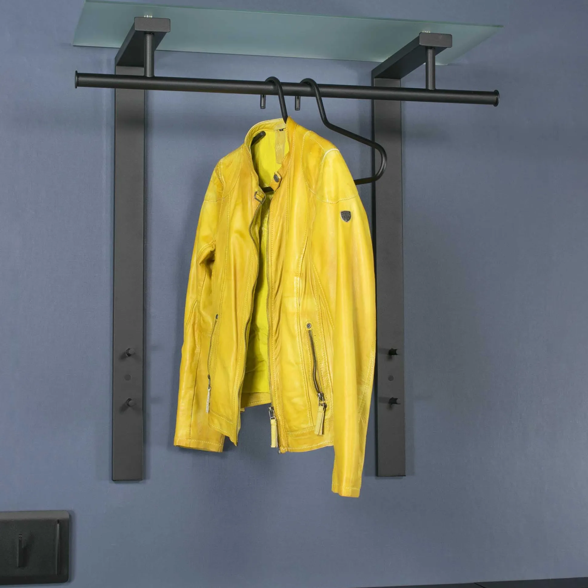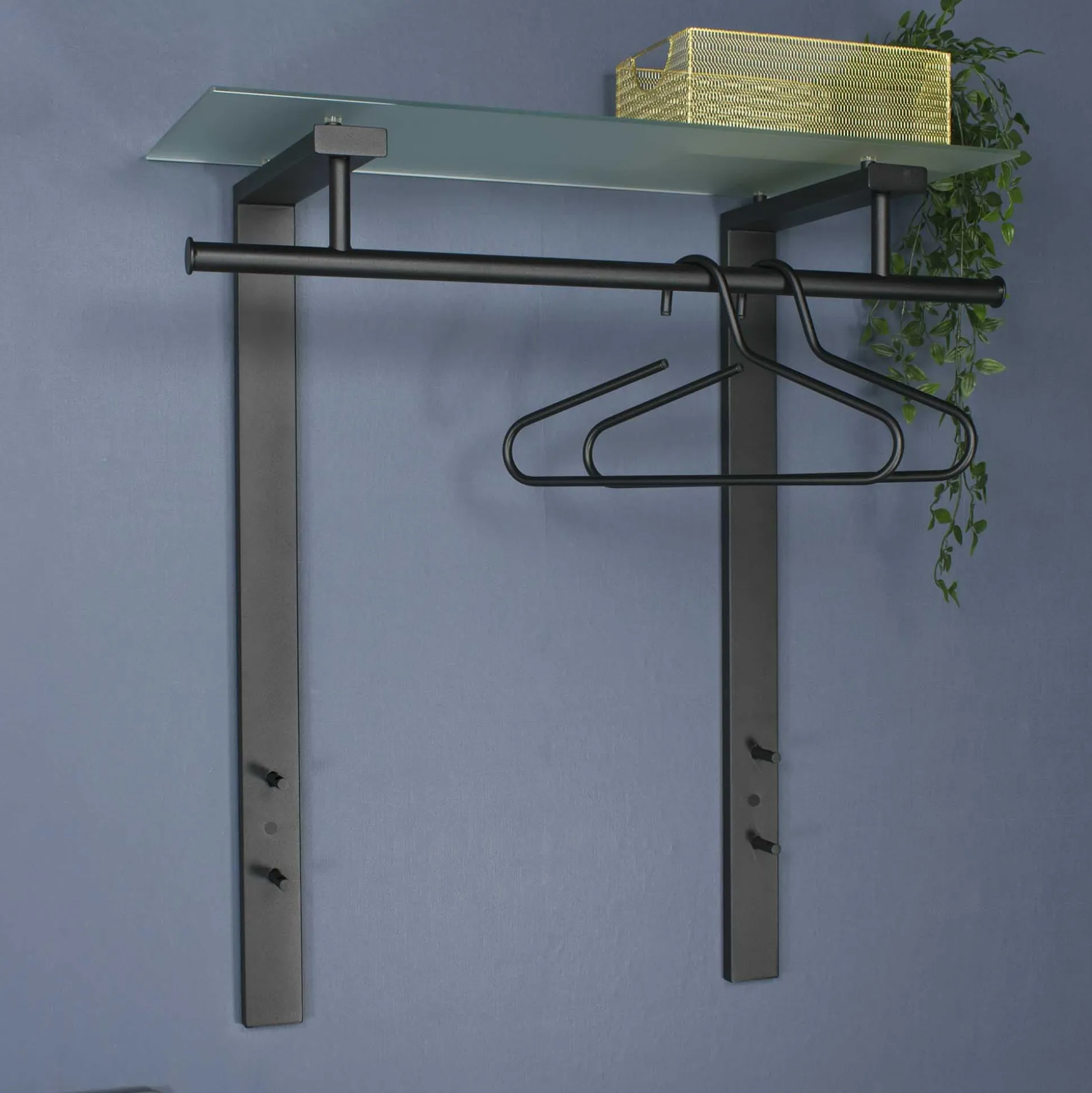 Moderne handige kapstok met bovenaan ruimte voor de kledinghaken. Bovenop een melkglazen blad met ruimte voor diverse kledingstukken. Exclusief de afgebeelde kledinghanger.