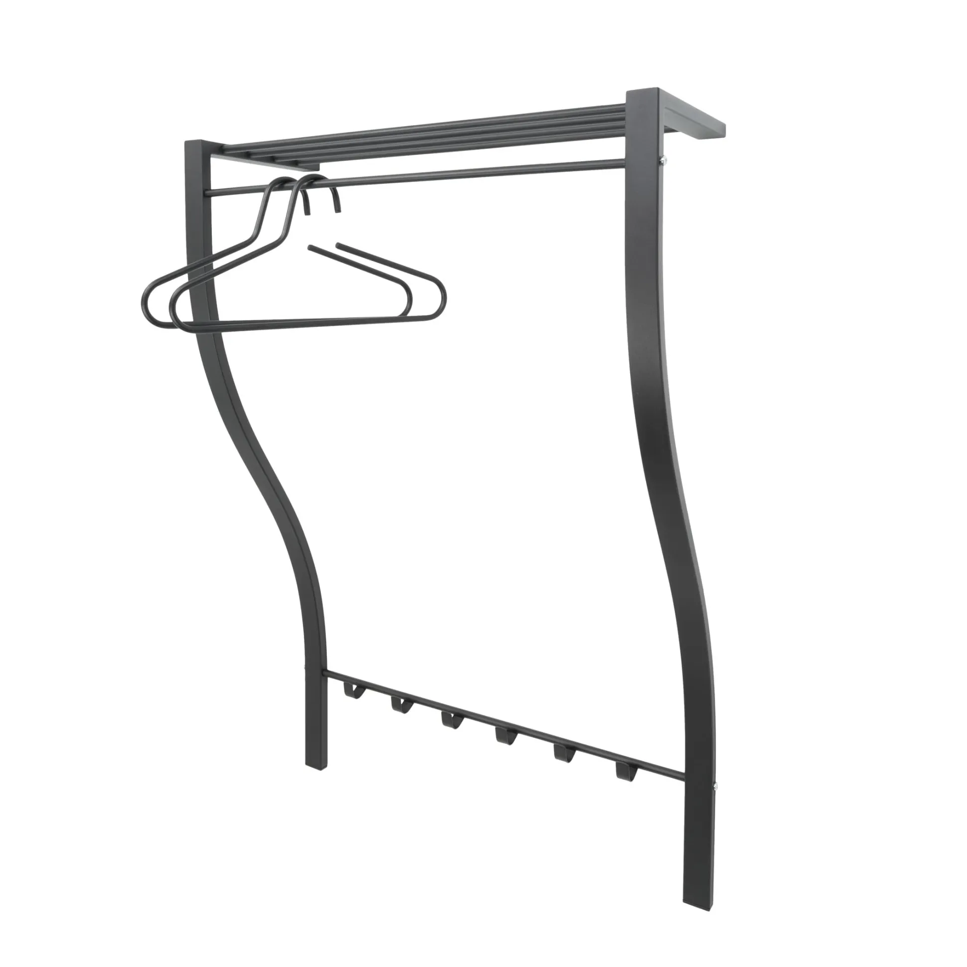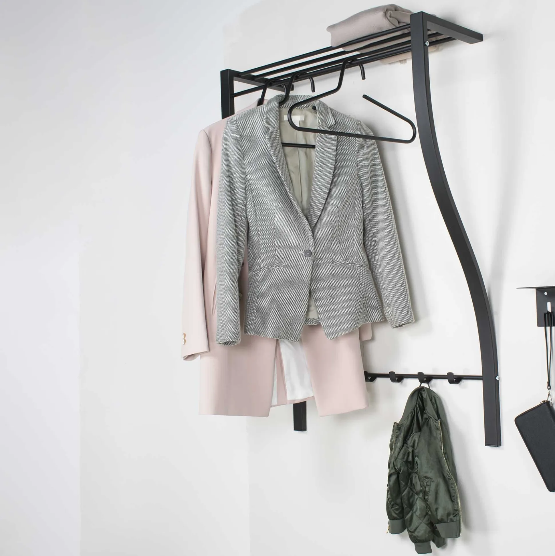 Moderne handige kapstok met bovenaan ruimte voor de kledinghangers en onderaan haken voor kinderjasjes of tassen. Bovenop is ruimte voor diverse kledingstukken. Exclusief de afgebeelde kledinghangers.