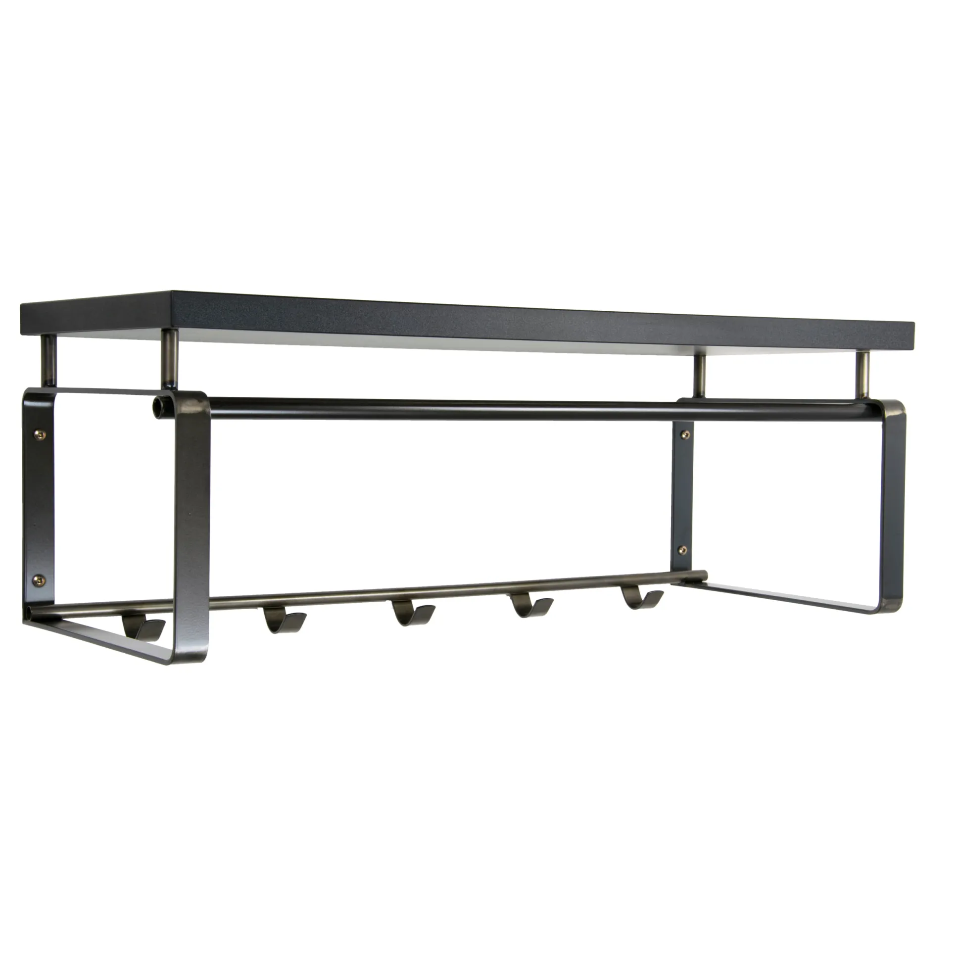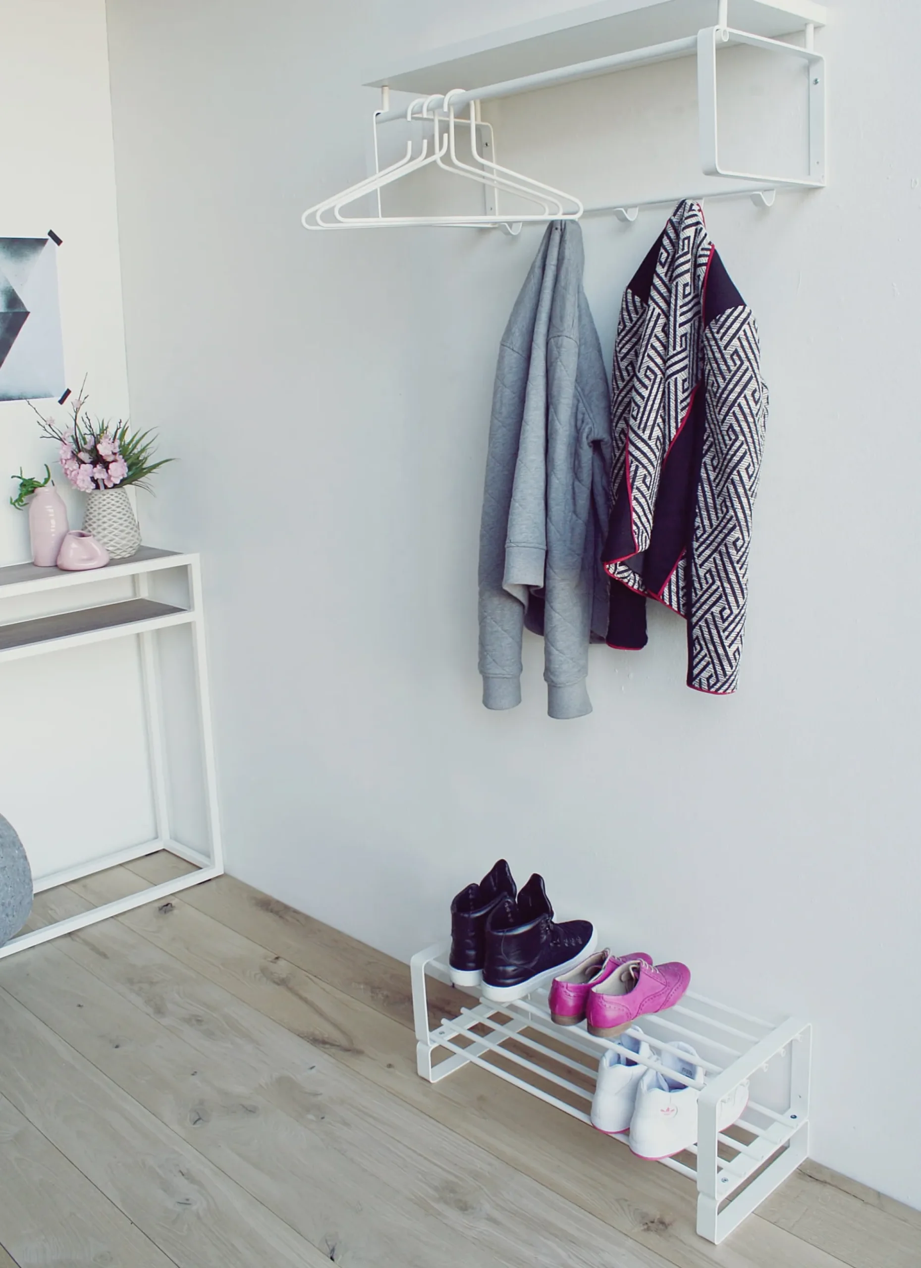 De kapstok is volledig gemaakt van hoogwaardig metaal en afgewerkt in een sterke witte fijnstructuur epoxy poedercoat. Exclusief de afgebeelde kledinghanger. Aan de onderste stang zitten 5 haken voor het ophangen van jassen en bovenop is een wit geverfde houten plank.