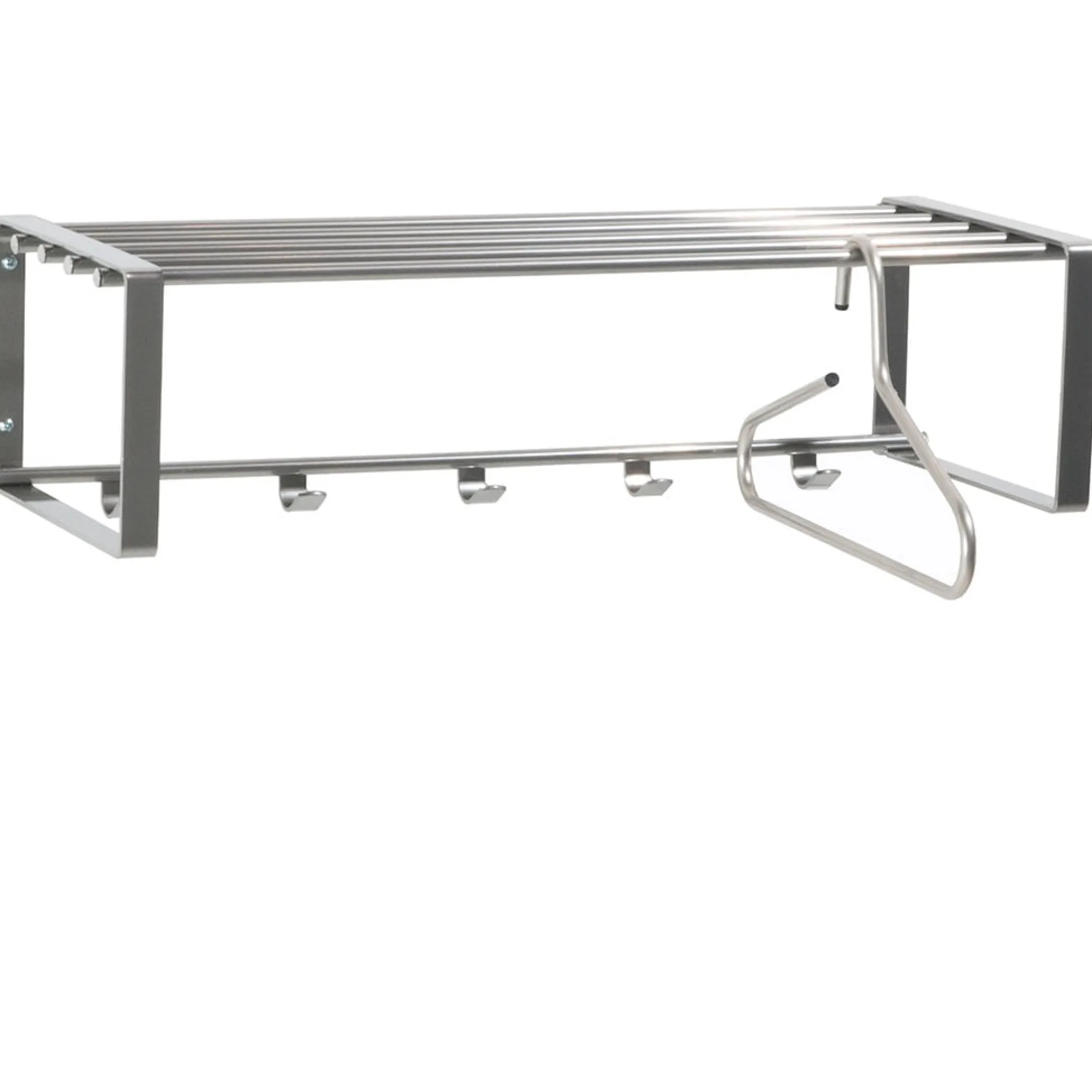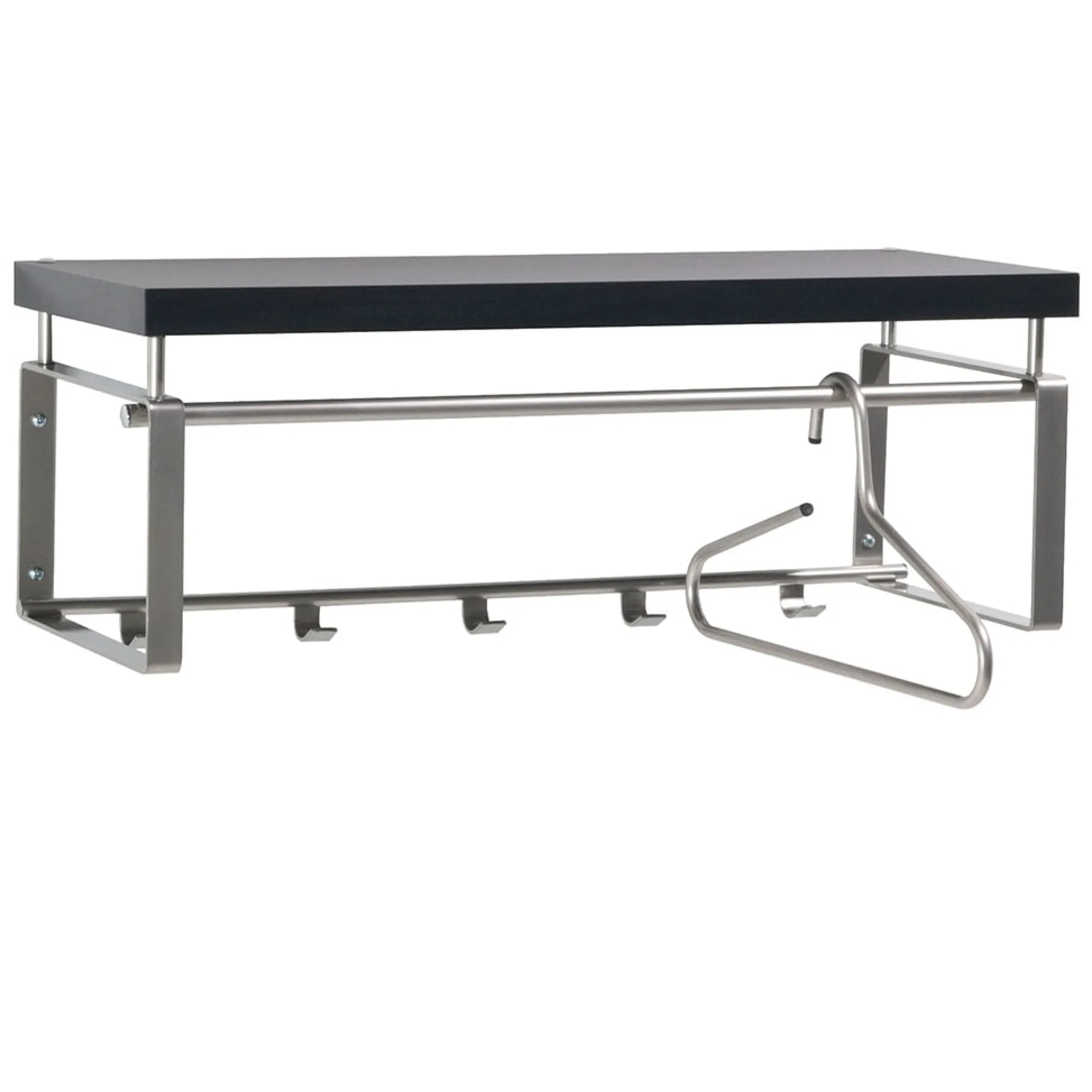 De kapstok is volledig gemaakt van hoogwaardig metaal en afgewerkt in een sterke zwarte fijnstructuur epoxy poedercoat. Exclusief de afgebeelde kledinghanger. Aan de onderste stang zitten 5 haken voor het ophangen van jassen en bovenop is een zwart geverfde houten plank.