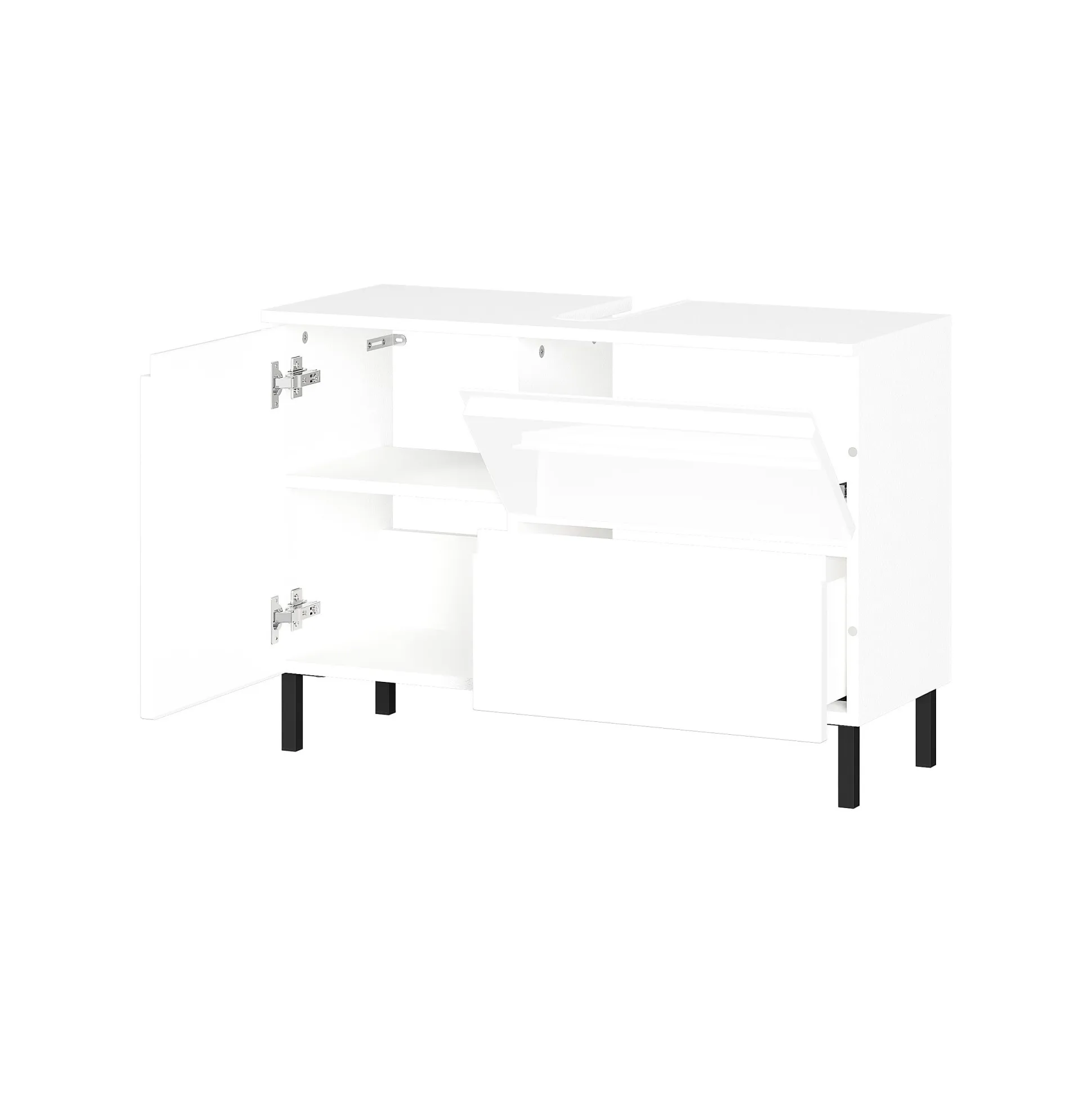Deze ideale wastafelkast voorziet je in voldoende opbergruimte. Achter de linker deur bevindt zich een verstelbare legplank, aan de rechterkant van het meubel een lade en een klep. Deze sluiten allen zacht en geruisloos door het soft-close systeem. Gepoedercoat metalen pootjes in combinatie met geruisloos sluitende deuren en laden maken dit meubelstuk helemaal af. Geproduceerd in Duitsland, dit staat voor degelijke kwaliteit en een lange levensduur. Gemakkelijk te monteren doormiddel van de meegeleverde montagehandleiding. Bekijk ook de andere elementen uit deze badkamerserie!