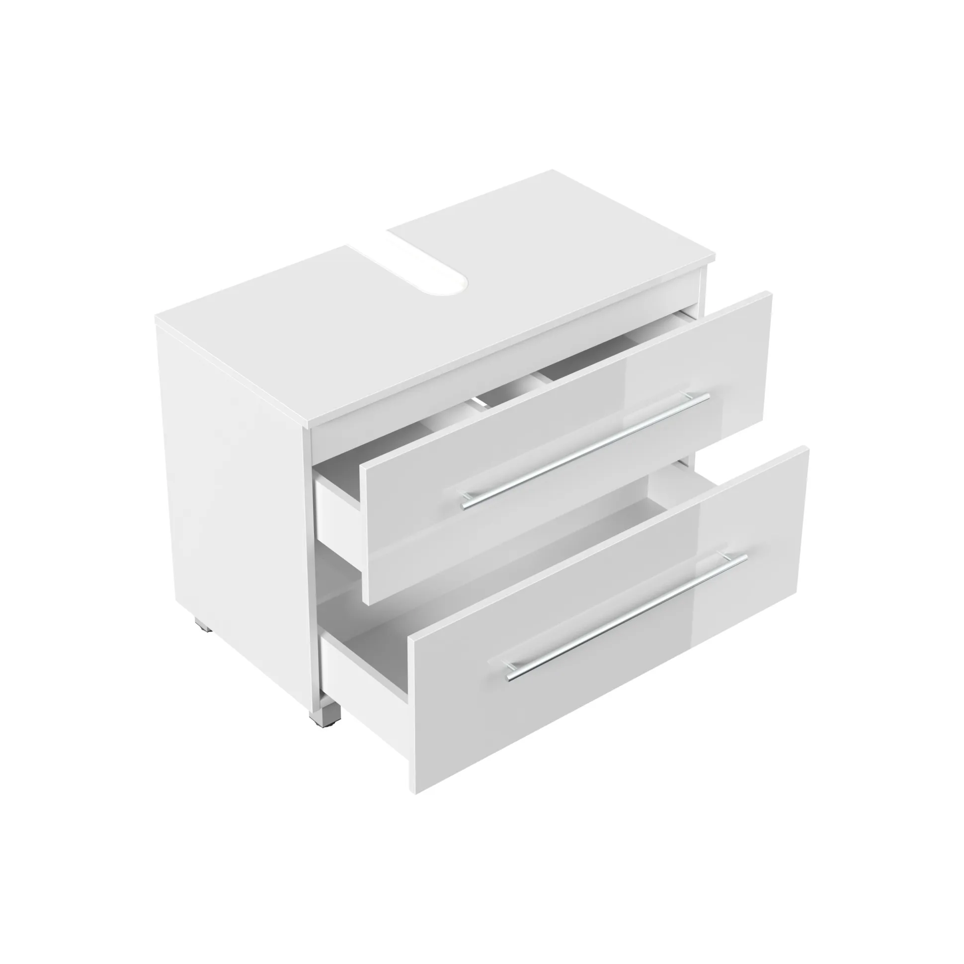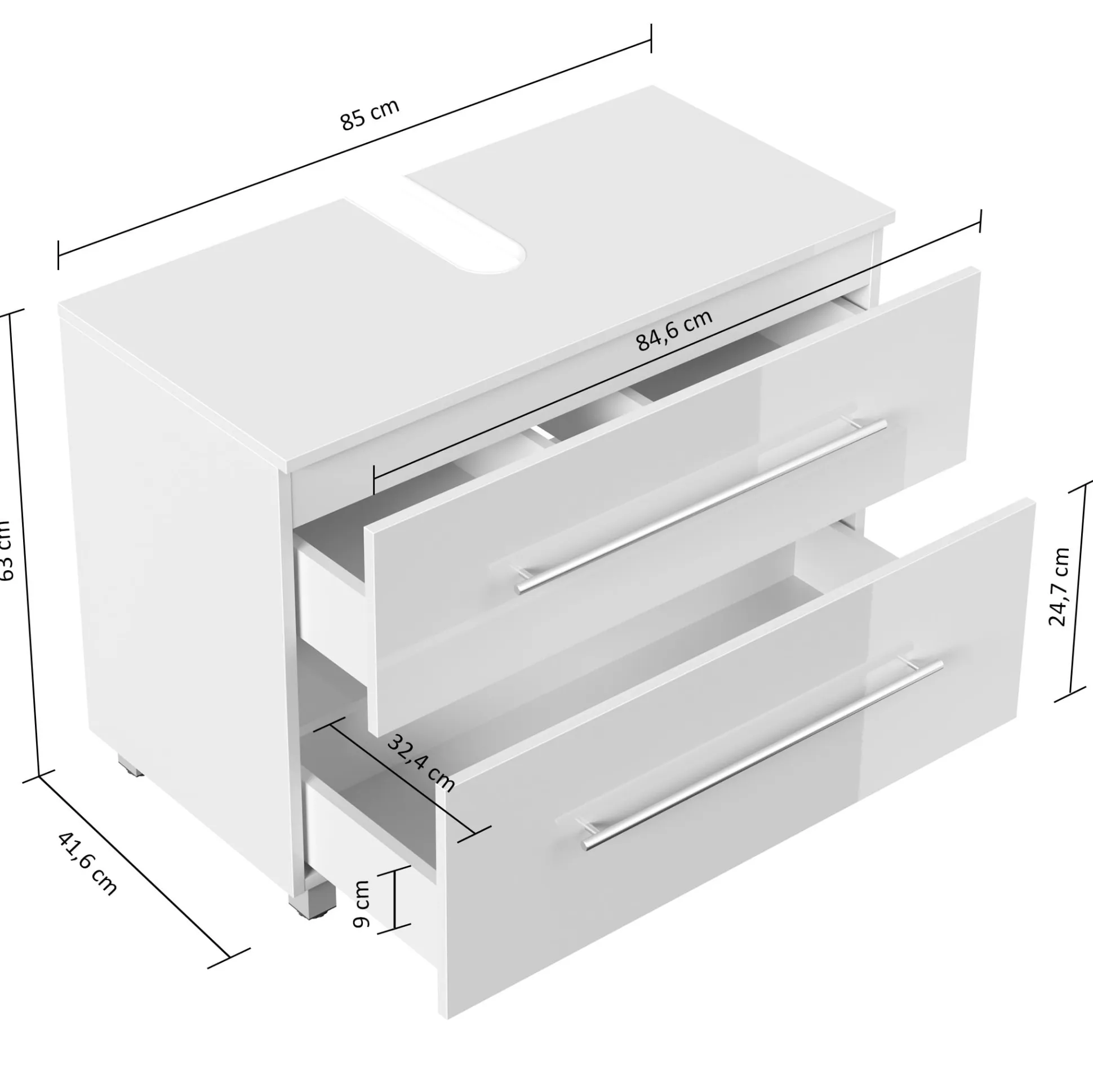 De wastafelkast Glasgow Wit Hoogglans 85 cm is een royale oplossing voor uw badkamer. Dit in Duitsland ontworpen meubel, vervaardigd uit hoogwaardig spaanplaat en afgewerkt met een glanzende witte lak, biedt een ruime opbergoplossing. Met een breedte van 85 cm, een hoogte van 63 cm en een diepte van 41,6 cm beschikt de kast over soft-close deuren en laden voor een soepele werking.