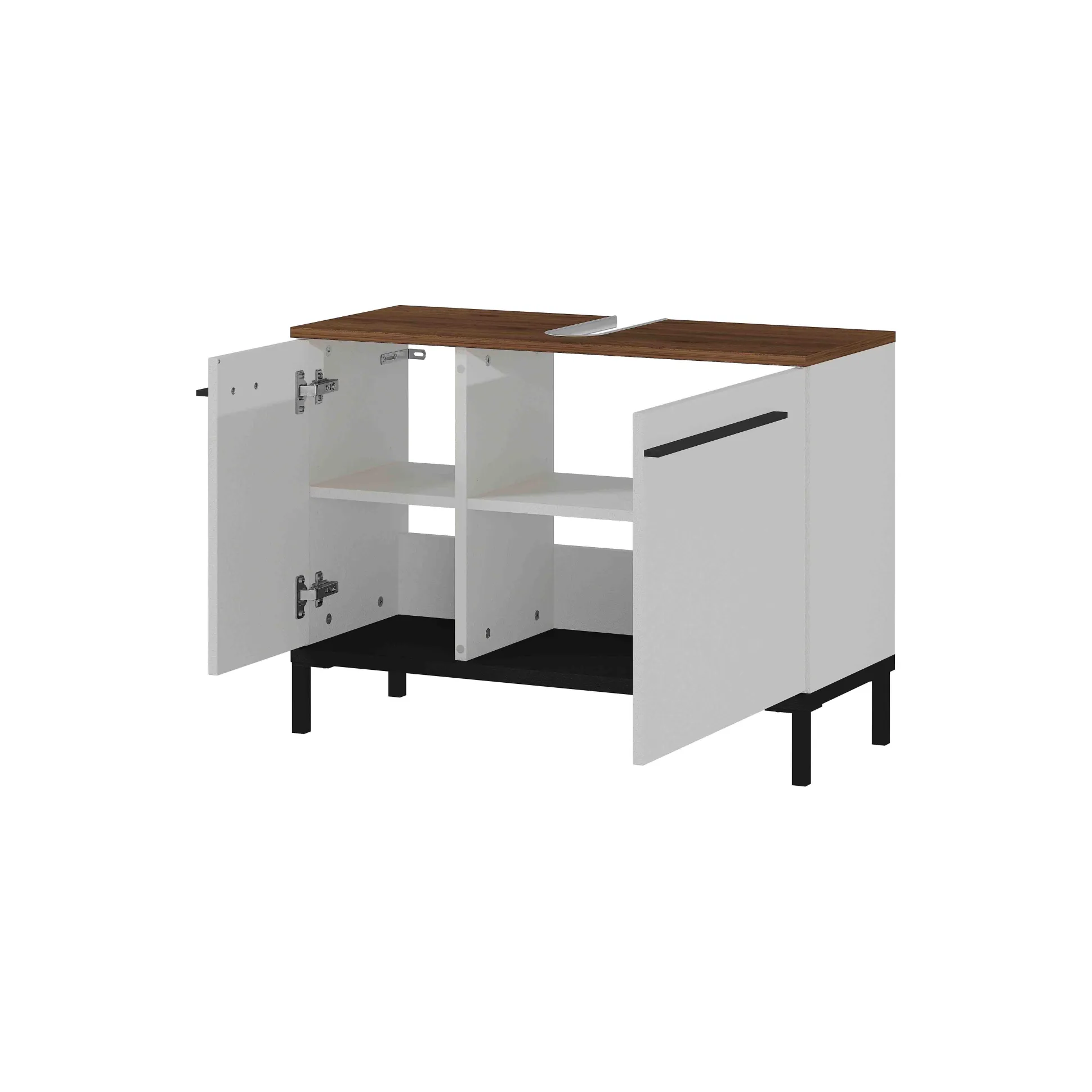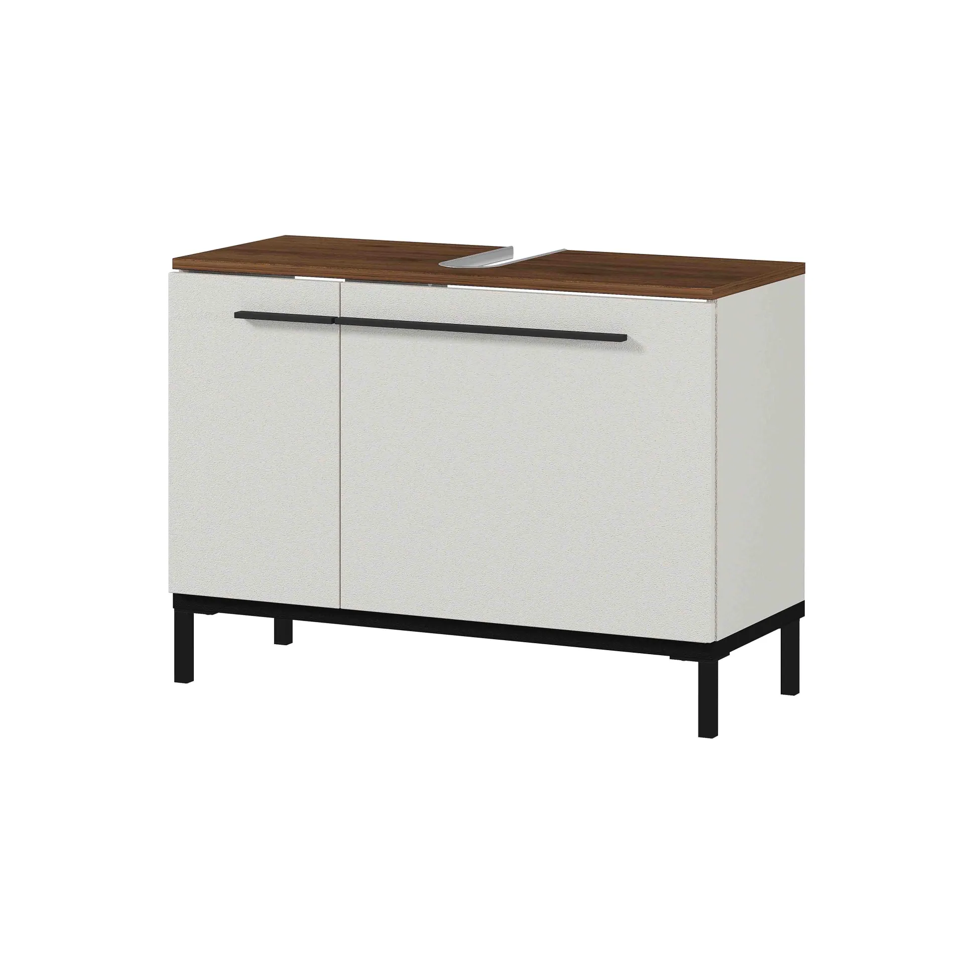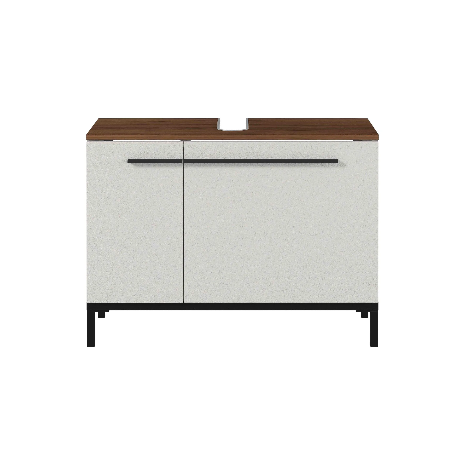 Deze stijlvolle badkamerkast vindt gemakkelijk zijn plaats. Voldoende opbergruimte achter de deuren op de 2 verstelbare legplanken. Zwart metalen handvatten en pootjes in combinatie met geruisloos sluitende deuren maken dit meubelstuk helemaal af. Geproduceerd in Duitsland, dit staat voor degelijke kwaliteit en een lange levensduur. Gemakkelijk te monteren doormiddel van de meegeleverde montagehandleiding. Bekijk ook de andere elementen uit deze badkamerserie!
