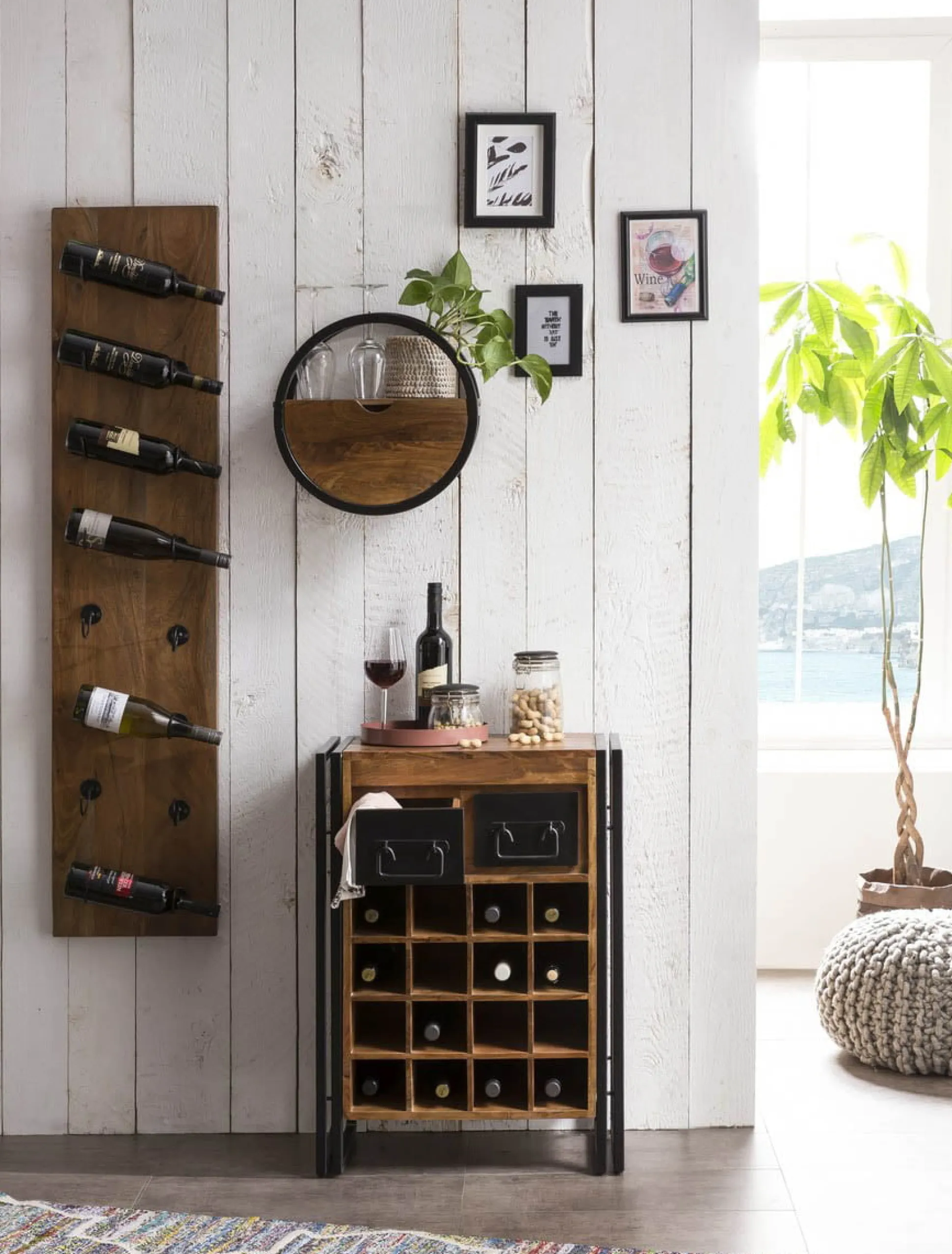 Dit praktische wijnrek biedt plaats aan 8 wijnflessen en is ideaal om op een stijlvolle en ruimtebesparende manier flessen op te bergen. De combinatie van acaciahout en metalen haken zorgt voor een rustieke, industriële uitstraling.